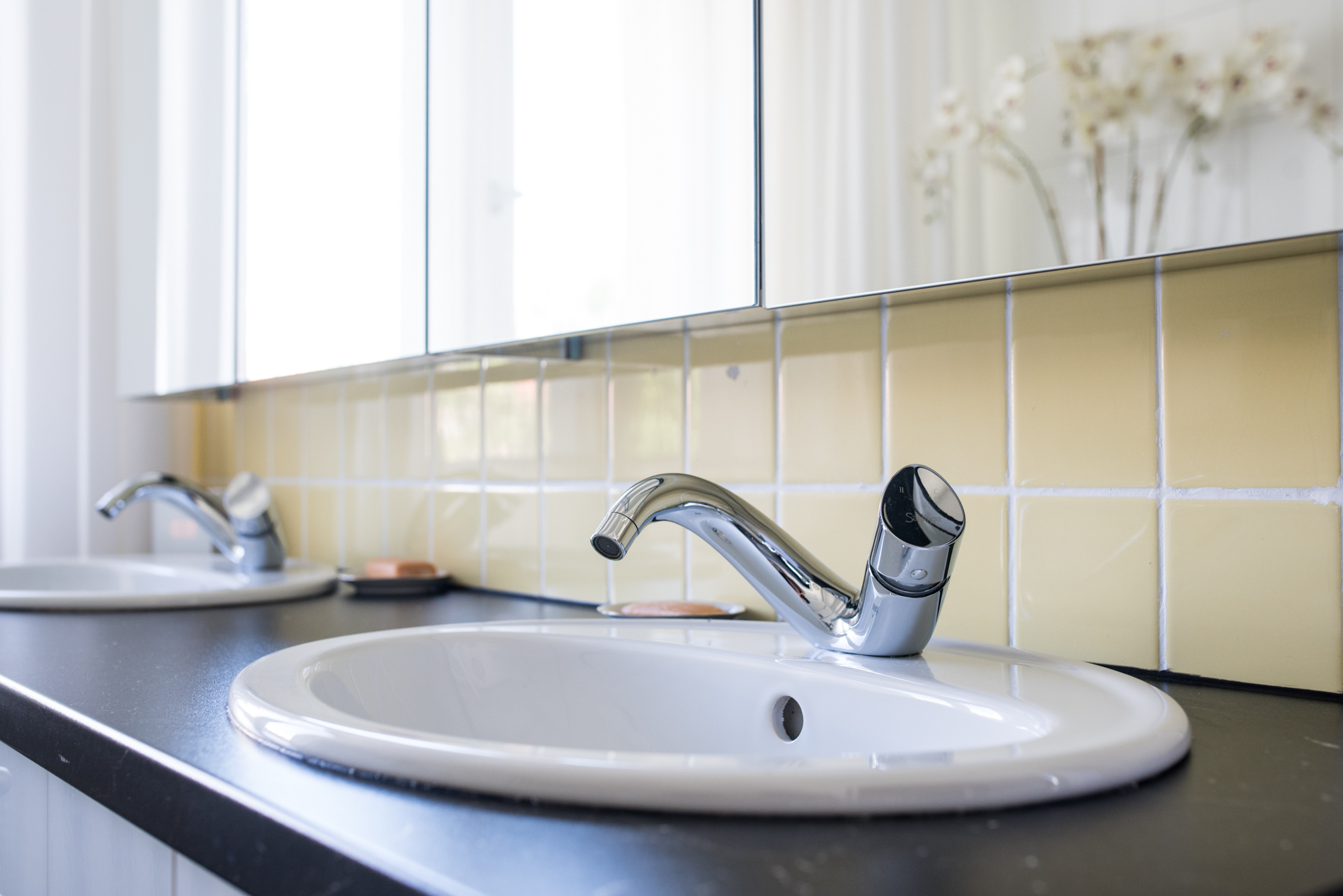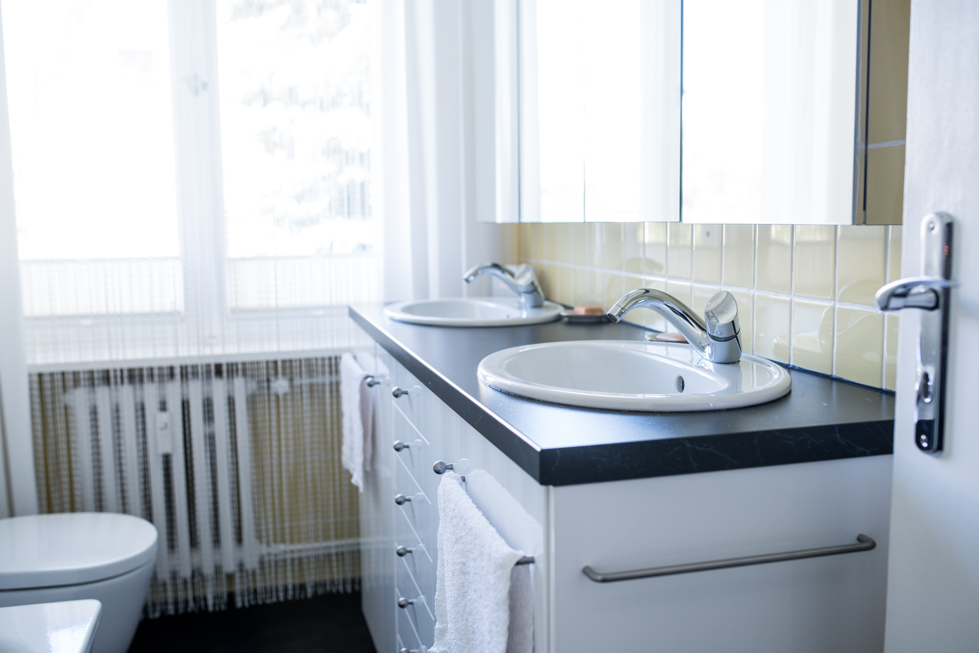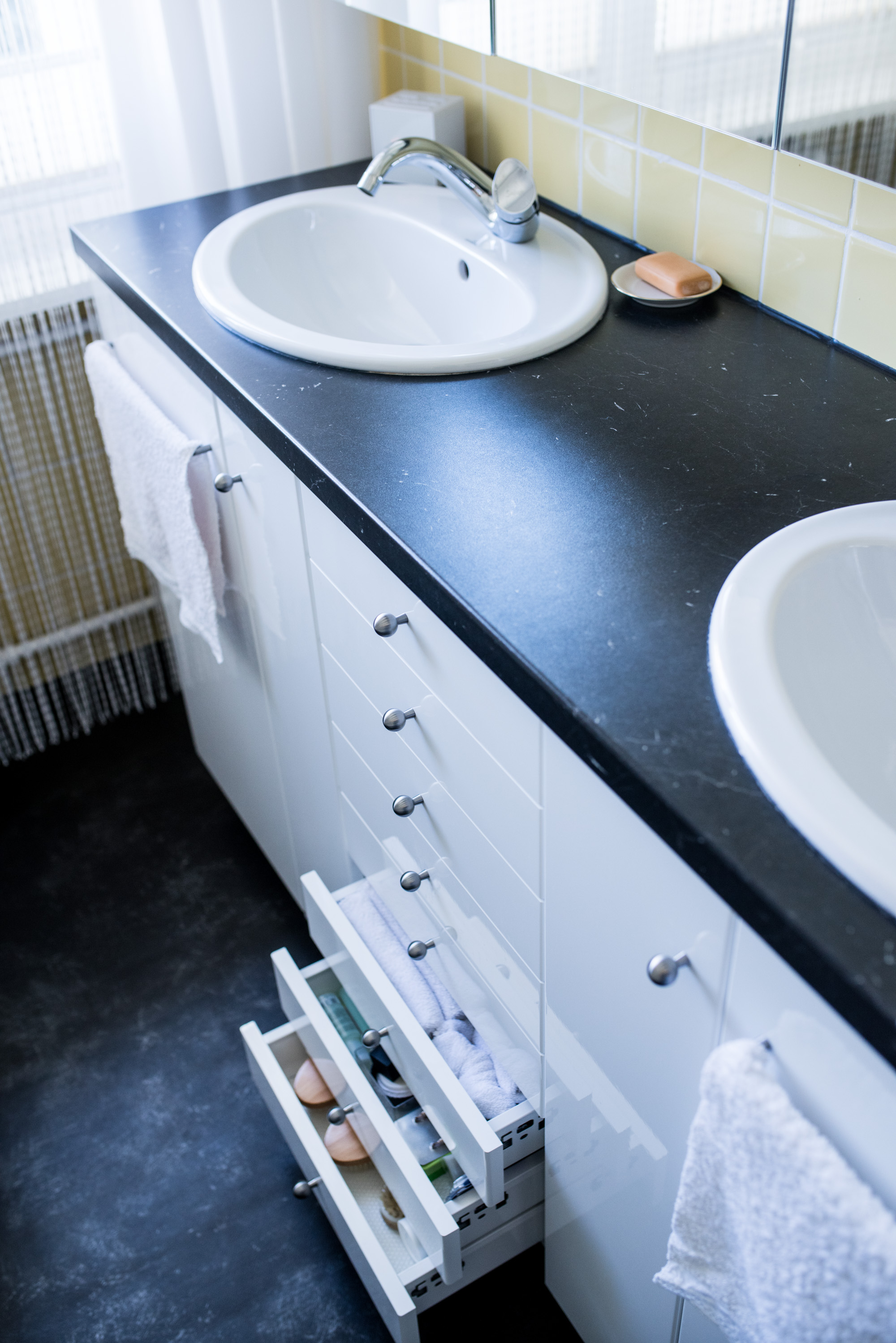 Neben den Waschbecken gibt es viel Abstellfläche – einfach praktisch