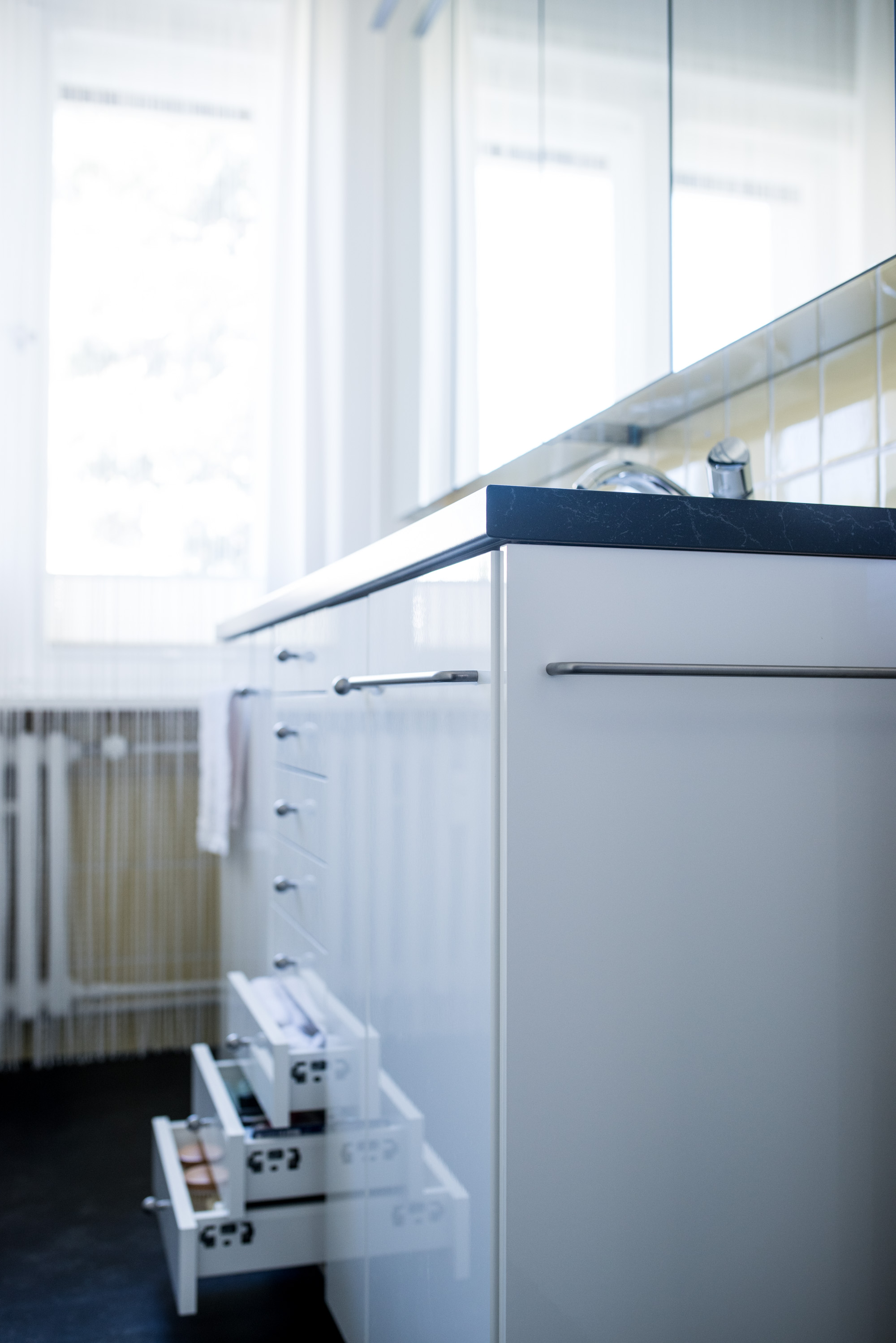 Dieses Altbaubad sollte frischer und moderner werden. Spiegelschränke mit Beleuchtung, ein Waschtisch mit eingelassenen Becken und viel Stauraum waren wichtige Kriterien für die Neugestaltung. Da es eine Mietwohnung ist, mussten die gelben Fliesen aus den 70igern erhalten bleiben.