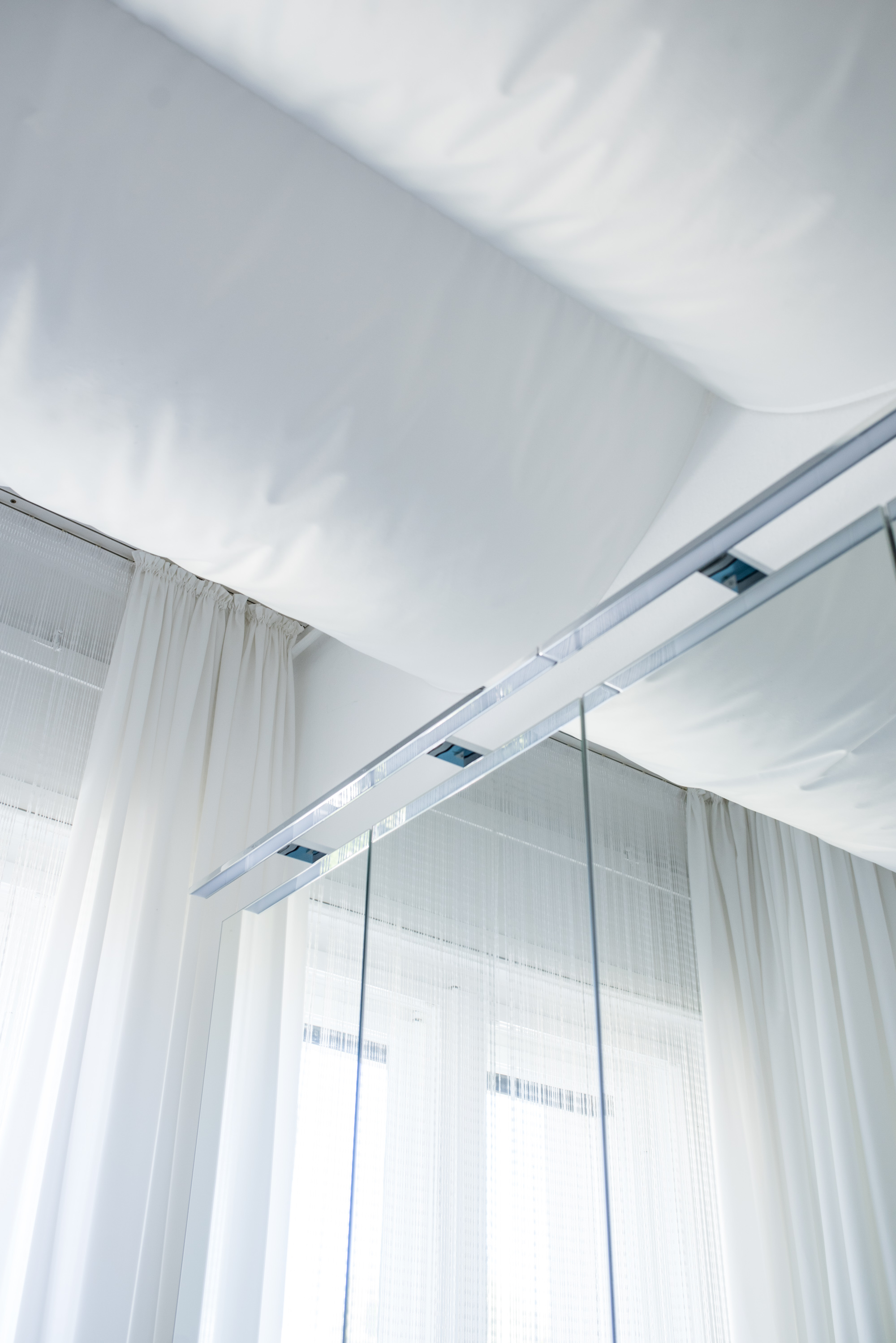Der weiße Deckenbaldachin versteckt die unschöne Decke des Raumes