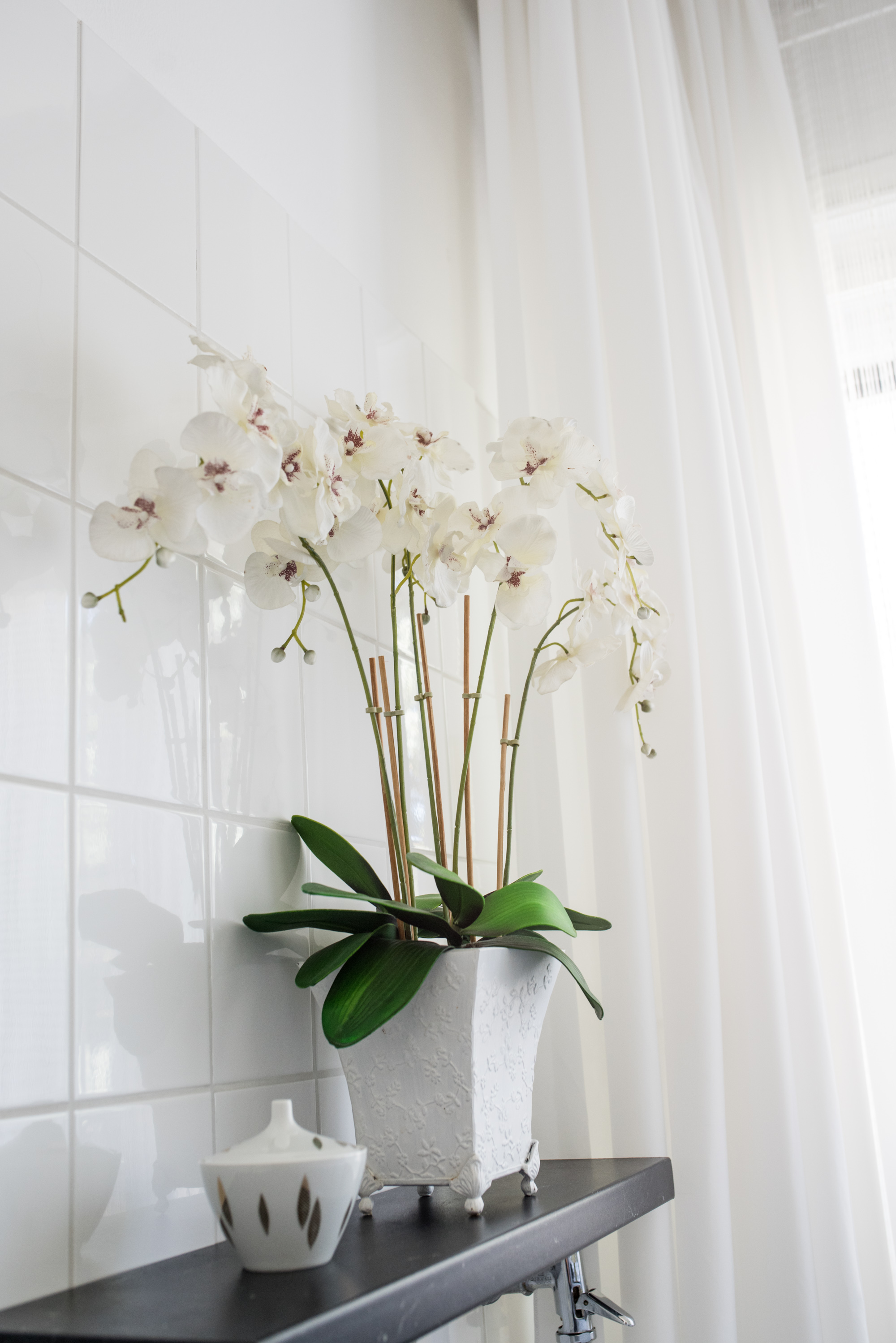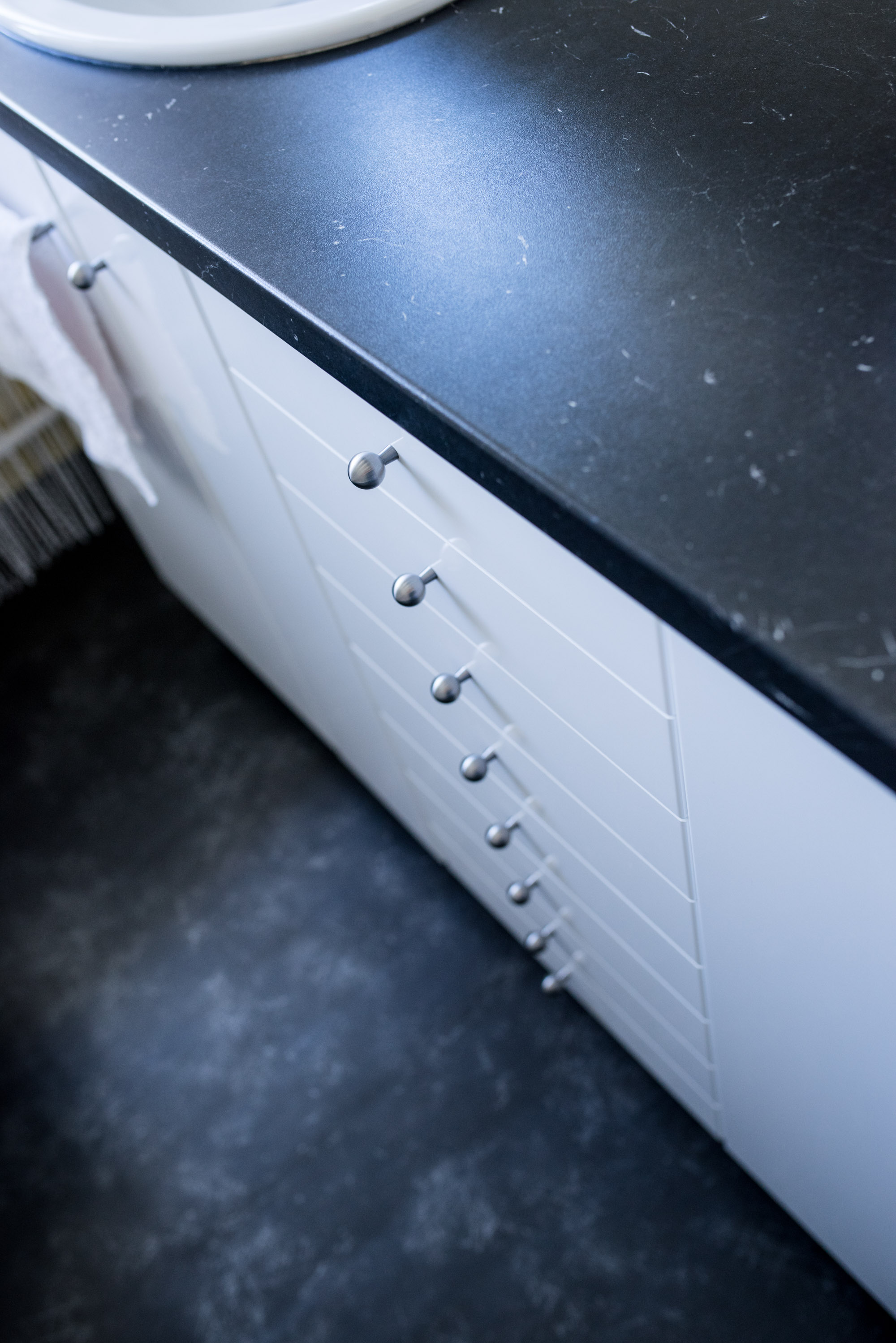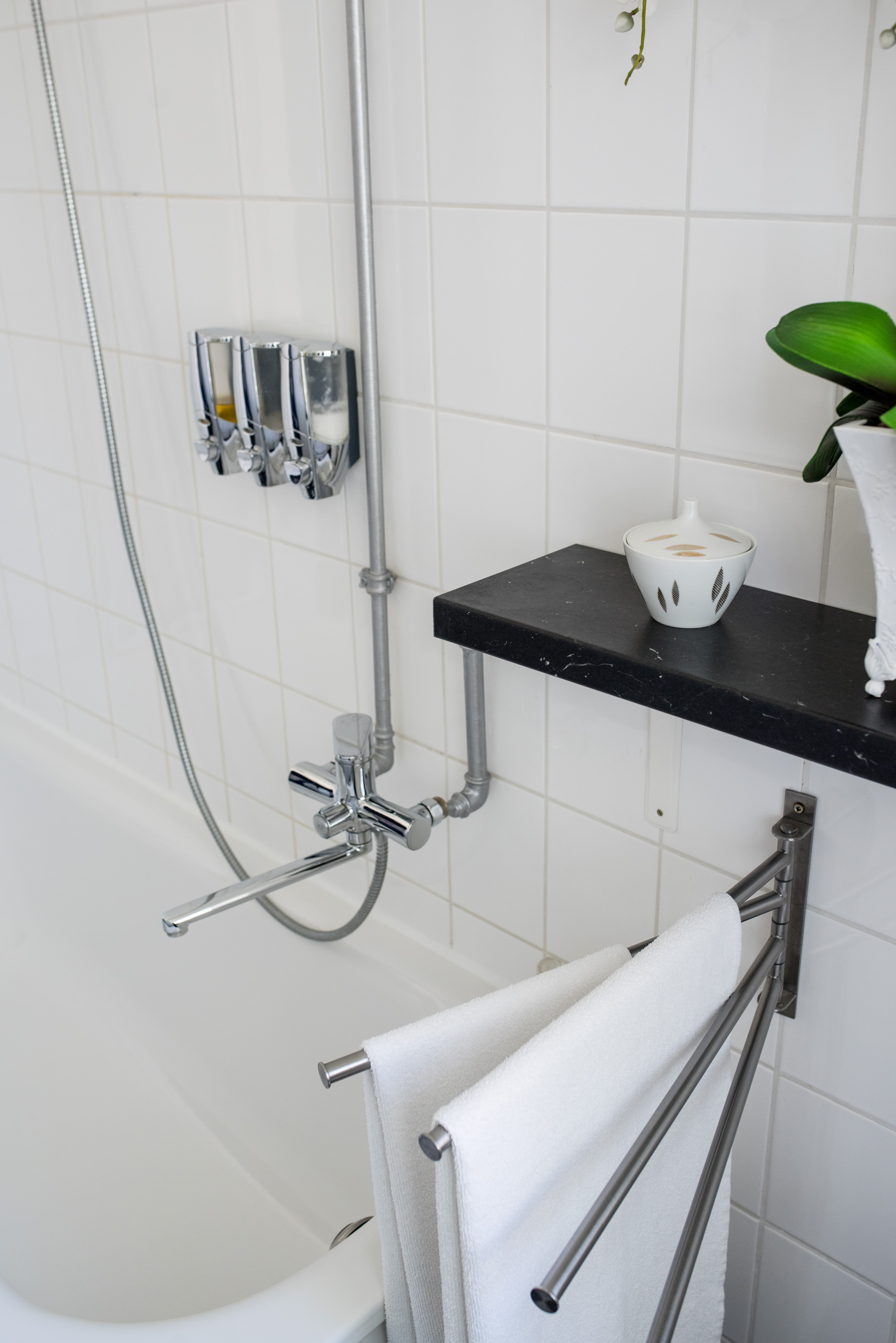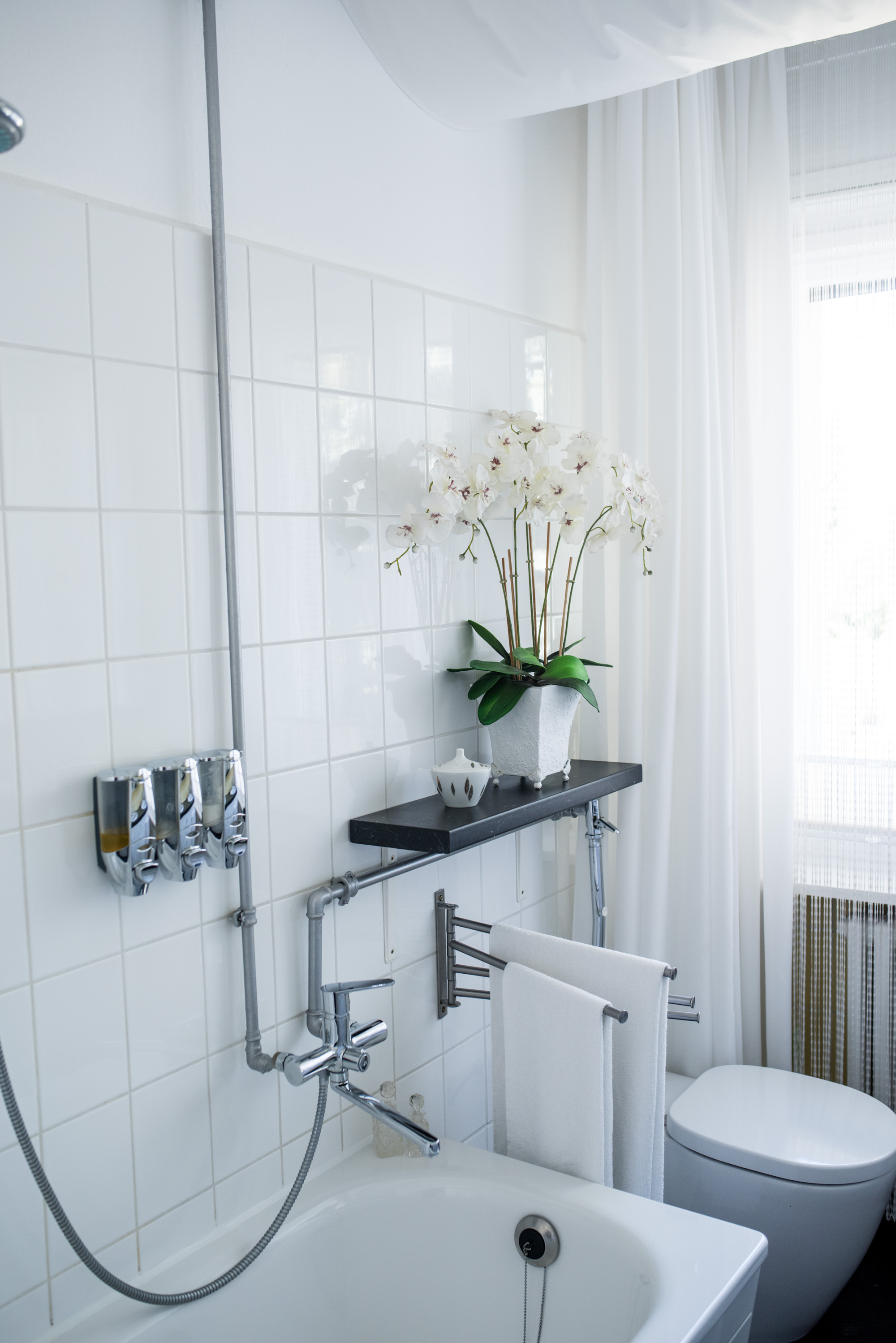 Diese wurden mit weißer Fugenfarbe aufgefrischt. Ein neuer schwarzer PVC-Belag wurde auf die vorhandenen alten Bodenfliesen geklebt und korrespondiert gut mit der schwarzen Tischplatte. In sie wurden zwei kleine ovale Waschbecken eingelassen. Die Türgriffe fungieren auch als Handtuchhalter. Die Decke wurde mit weißem Stoff abgehängt und sorgt so auch für eine weiche Akkustik. Künstliche Orchideen blühen das ganze Jahr und sind sehr pflegeleicht. Unschöne Wasserleitungen stören meist, aber verstecken fuktioniert auch nicht. Deshalb wurden sie silberfarben lackiert und kurzerhand in die Gestaltung mit einbezogen.
