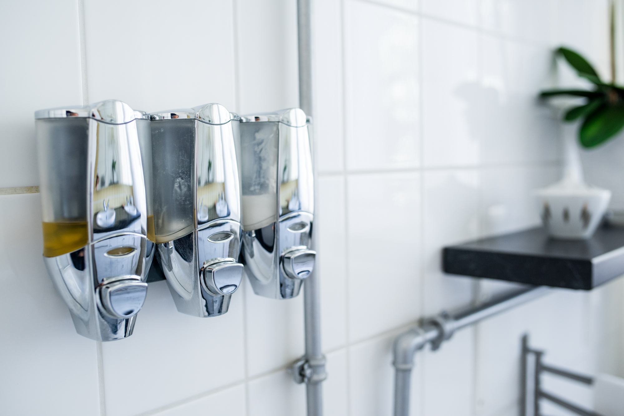 Der Seifenspender paßt gut zum Design und die vielen bunten Flaschen gehören der Vergangenheit an