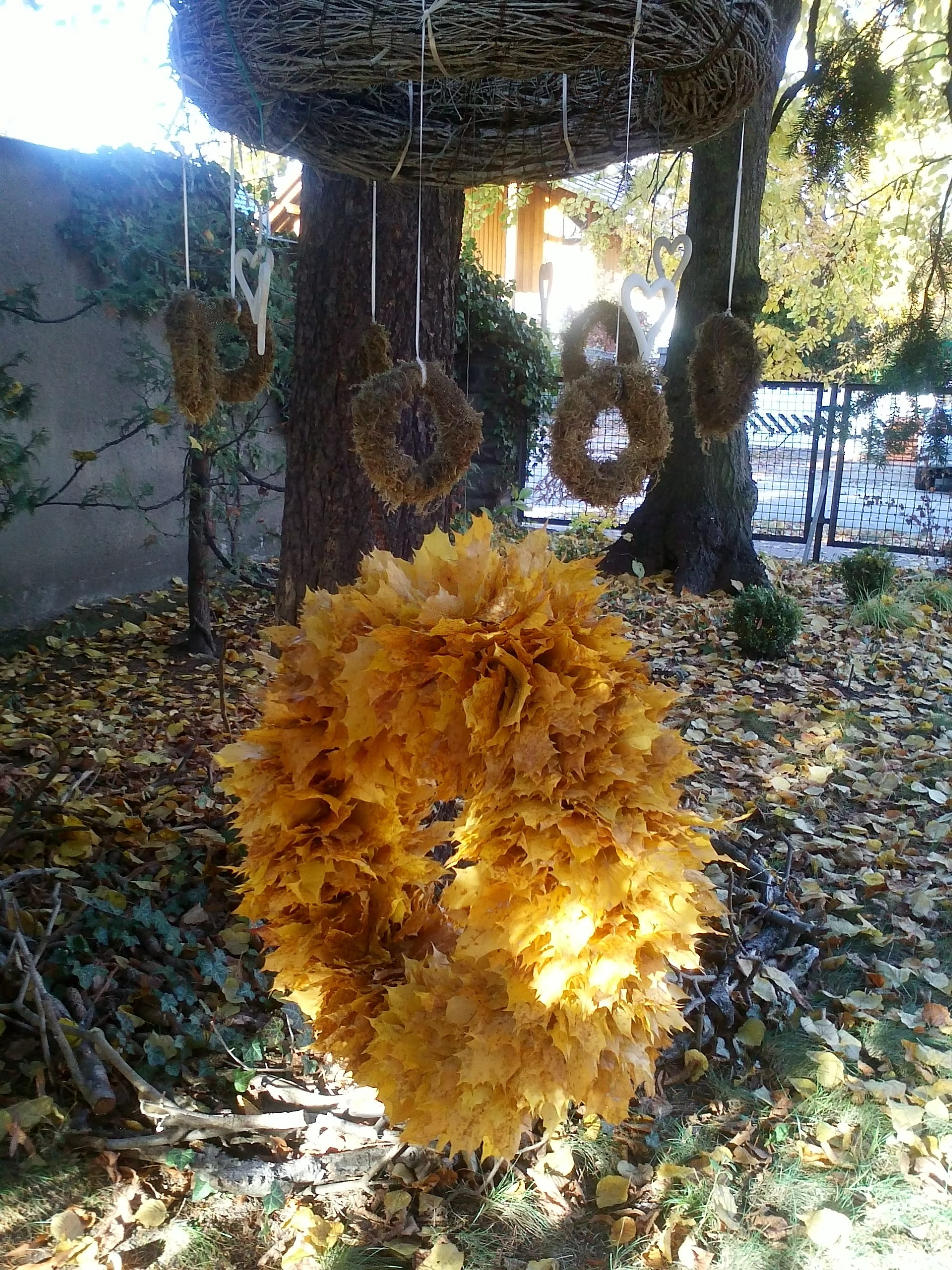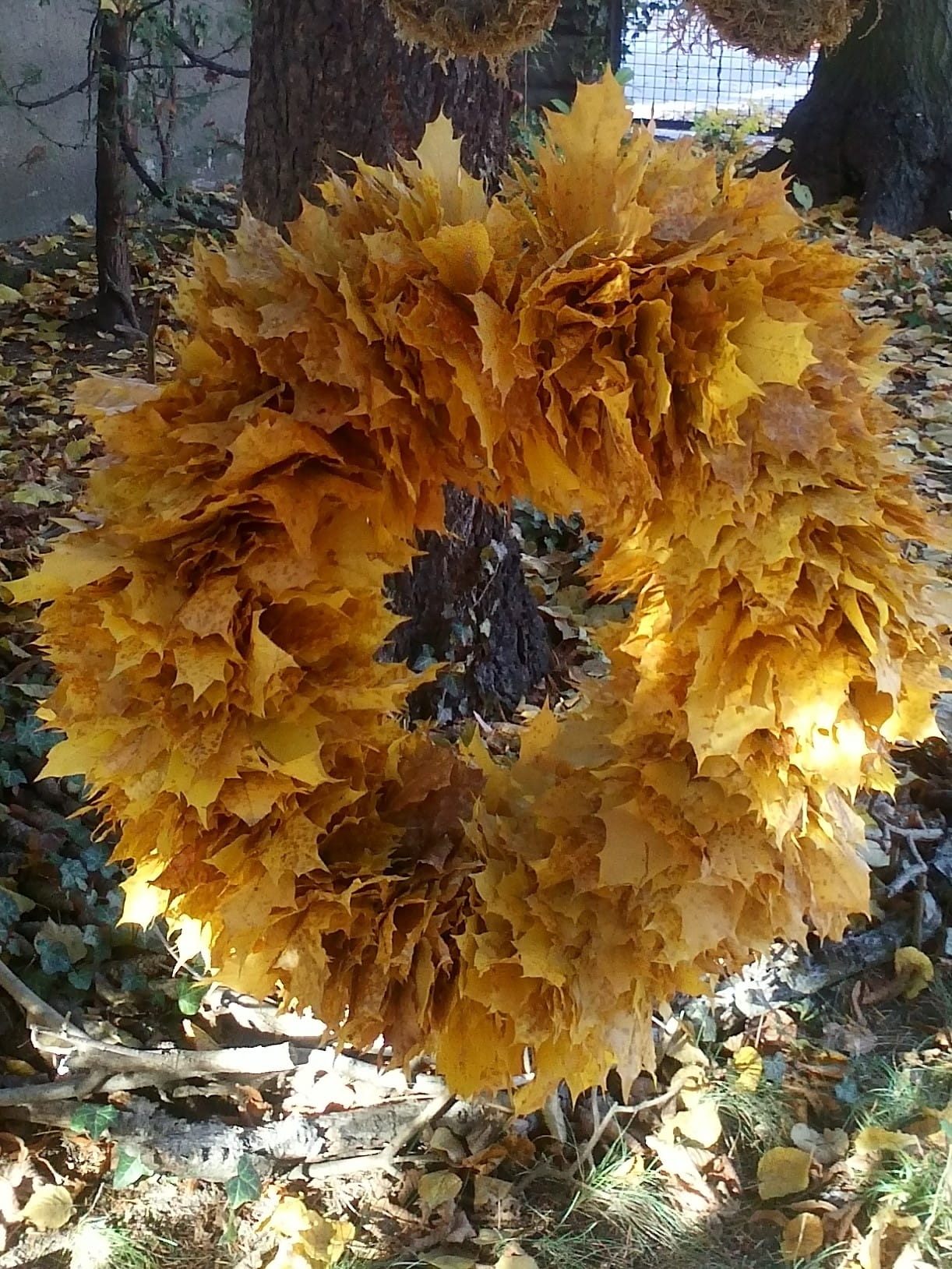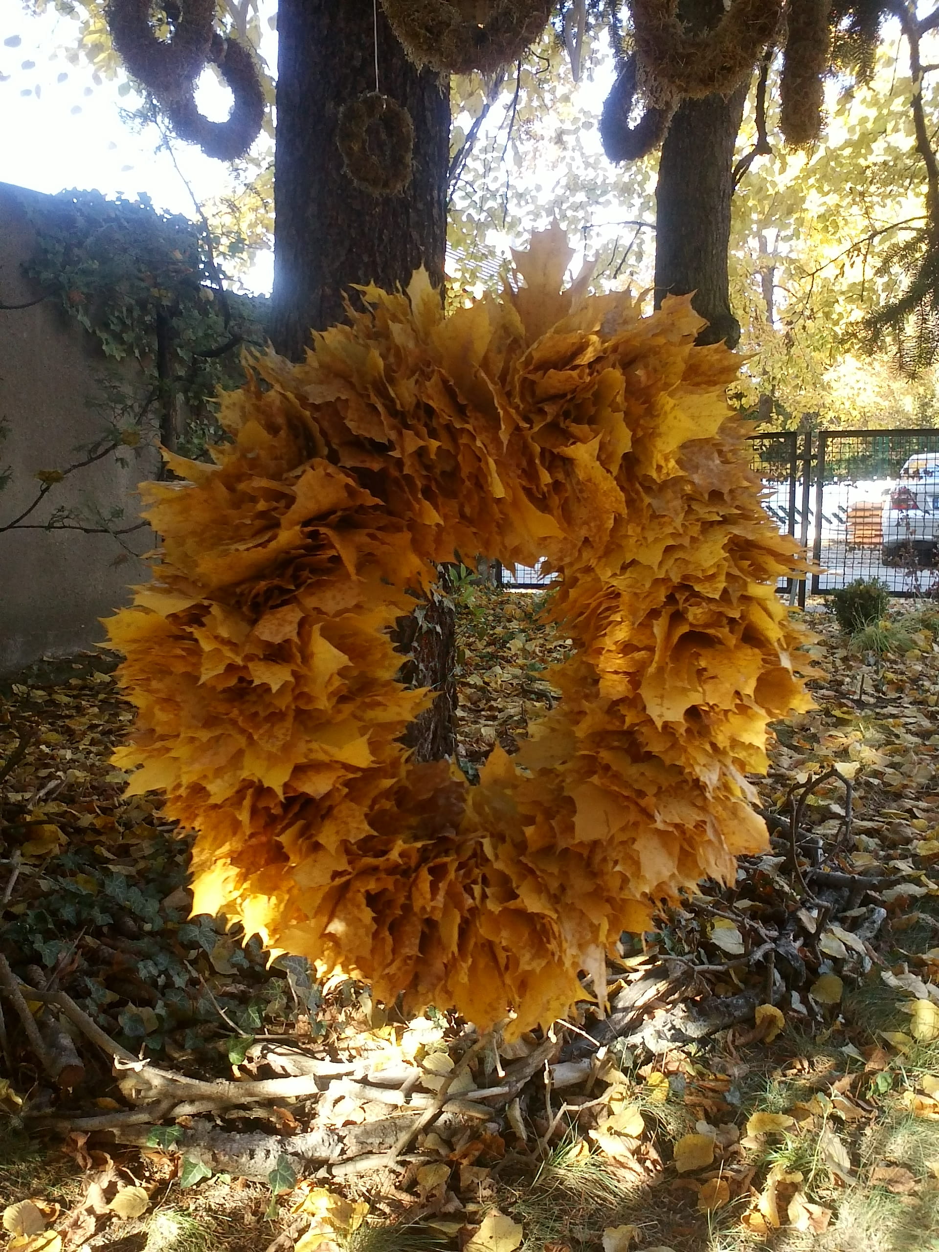Wie Bernstein leuchtet dieser große Blätterkranz in der Herbstsonne. Ganz und ausschließlich aus Platanenblättern wurde er während eines Spazierganges im Park gebunden.