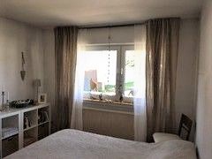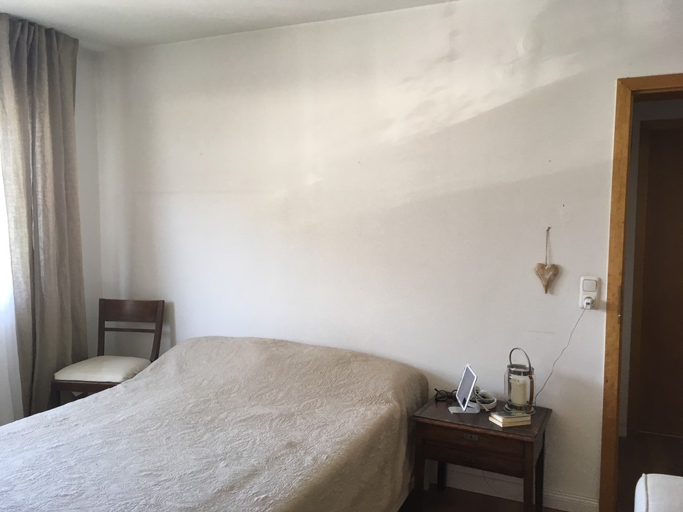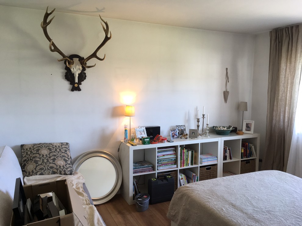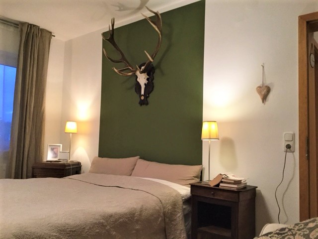 Die grüne Farbfläche wird zum Kopfteil und macht das Bett zum Mittelpunkt. Das Geweih wird von der Besitzerin geliebt und paßt perfekt zur Lage der Wohnung, am Waldrand.
