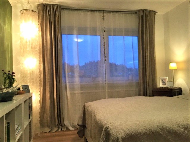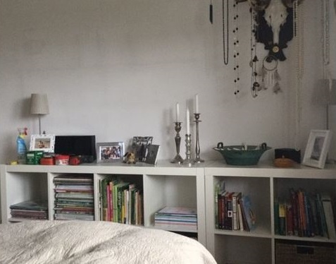 Das Schlafzimmer sollte sich völlig verändern, doch das Budget war klein und die geliebten Möbel sollten erhalten bleiben. Die vorhandenen Kissen waren die Grundlage für die Farbgestaltung, ein Moosgrün sollte den gesamten Raum aufwerten und gleichzeitig wohnlich machen. Das Bett bekam ein „gemaltes“ Kopfteil und wurde so zu einem völlig neuen Möbelstück. Auch die gegenüber liegende Wand wurde in dieser Farbe gestrichen und schaffte so einen schönen Hintergrund für das Regal und den silberenen runden Spiegel.
