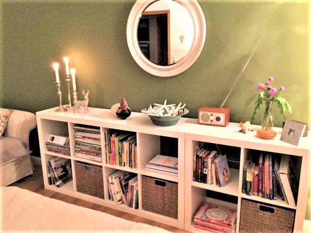 Das Moosgrün bringt Regal, Spiegel und Deko richtig zu Geltung.