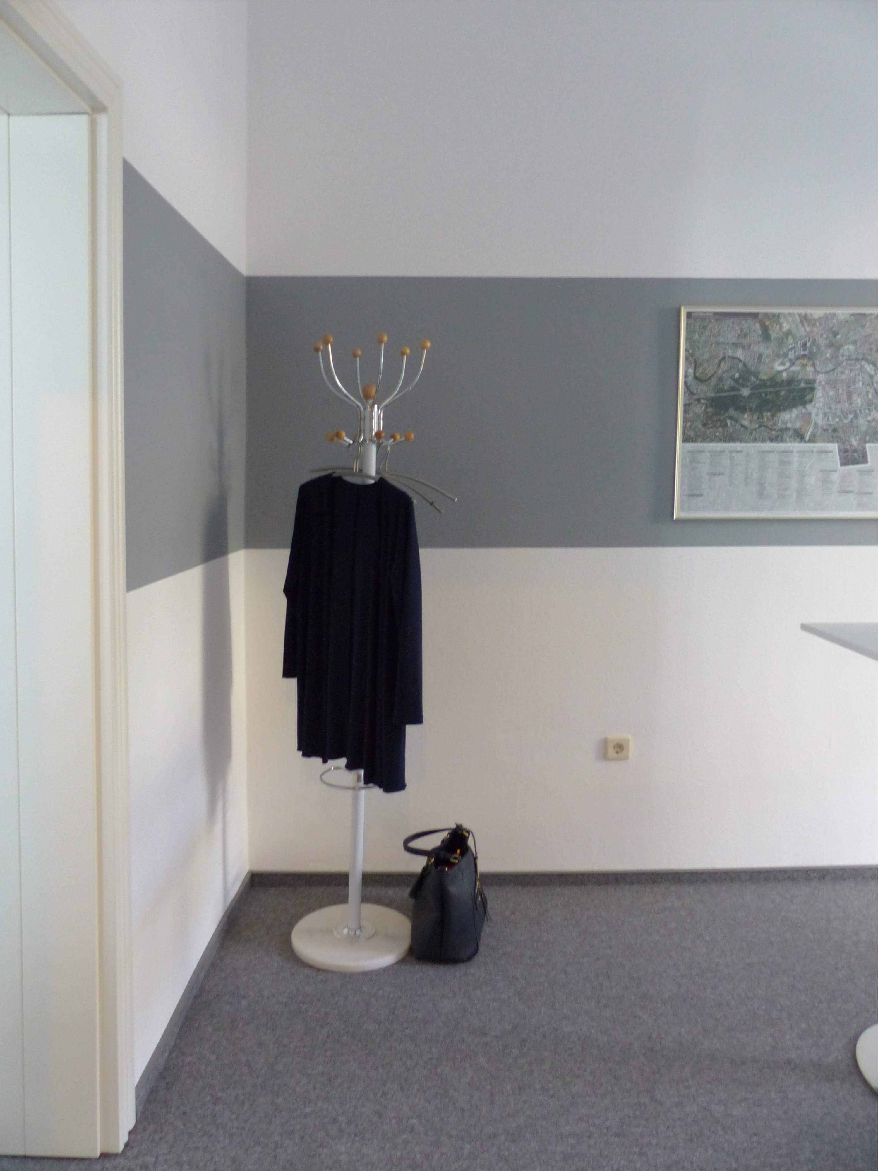 Die Wahl fiel auf Weiß und Grau, ein unaufgeregtes Duo, dass sich ganz im Hintergrund hält. Dadurch wird die Aufmerksamkeit auf Themen und Lerninhalte nicht gestört. Modern und ruhig verbindet der graue Farbstreifen Schulungs- und Aufenthaltsraum und läßt ein harmonisches Ganzes entstehen.