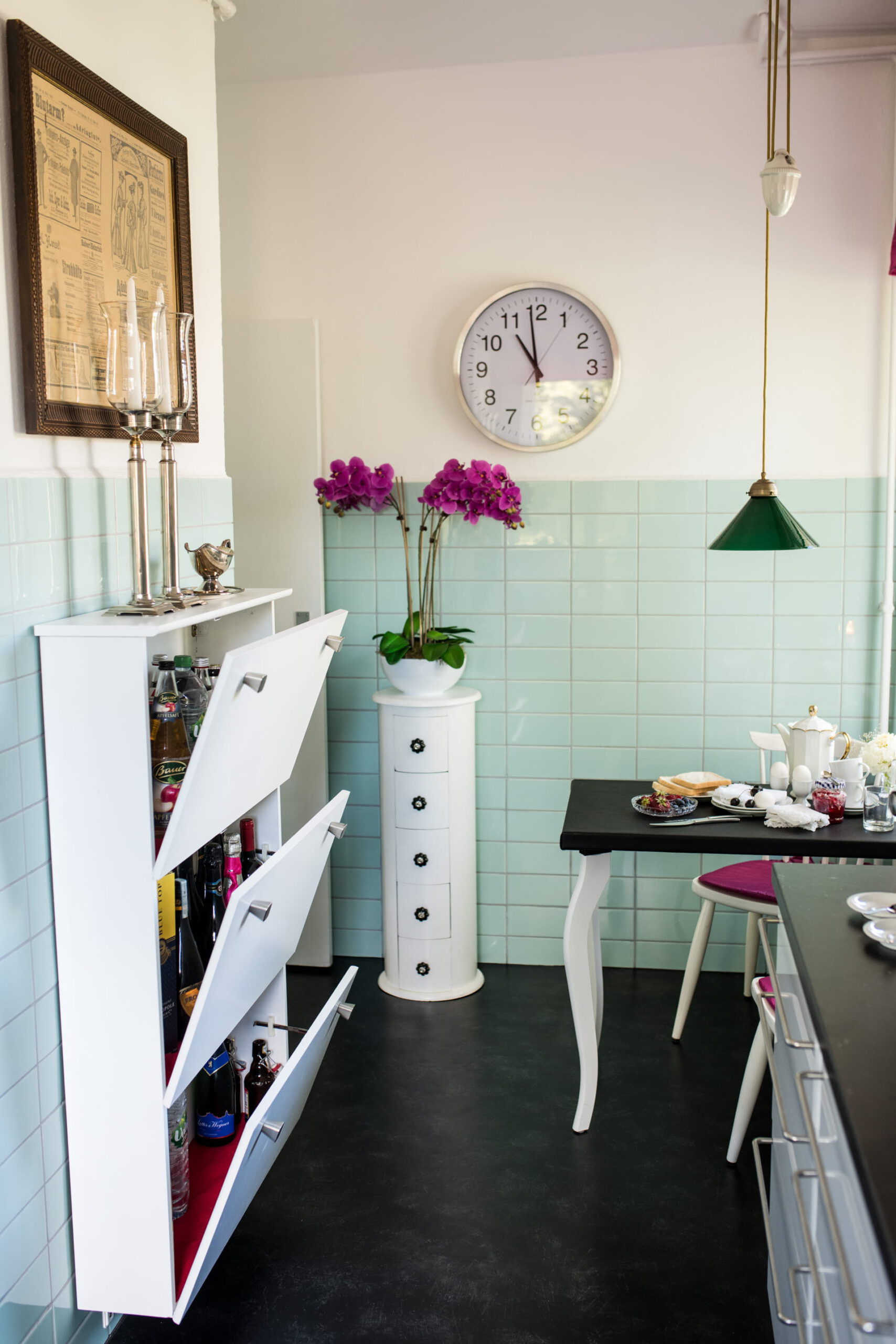 Niemand wollte ihn haben, diesen alten Schuhschrank, und zum Entsorgen war er einfach zu Schade, da kam die rettende Idee: Warum nicht anders nutzen? In der renovierten Küche war noch kein guter Platz für die Getränke gefunden, das war seine Chance auf ein zweites Leben! Das Innenleben wurde ausgebaut und die Böden geschlossen. Dann wurde alles 3 x mit einem Schwammroller lackiert. Zum Schluss wurden Magnetschließen und neue Knöpfe angebaut und fertig war die Flaschenbox für eine frisch renovierte Küche.