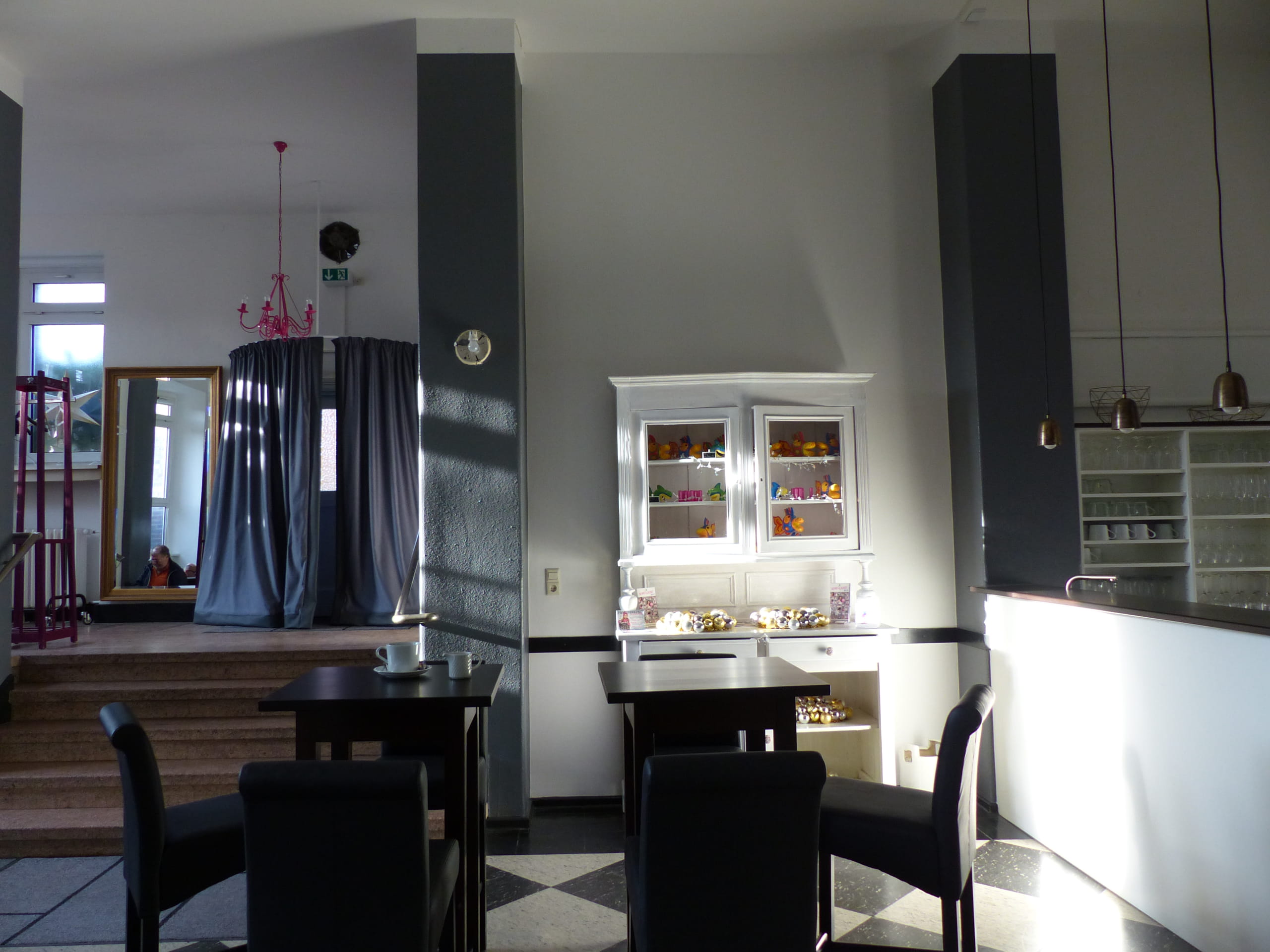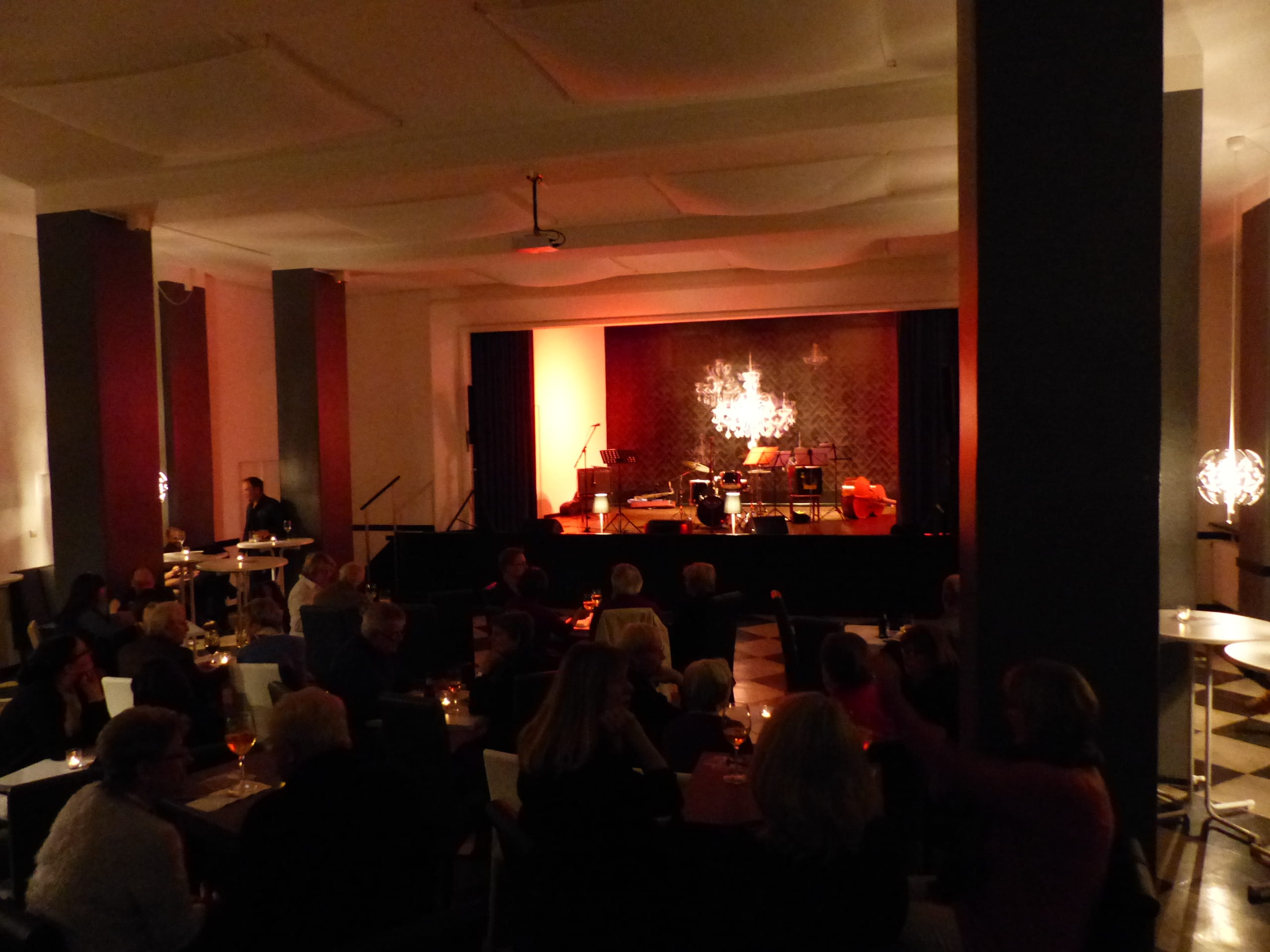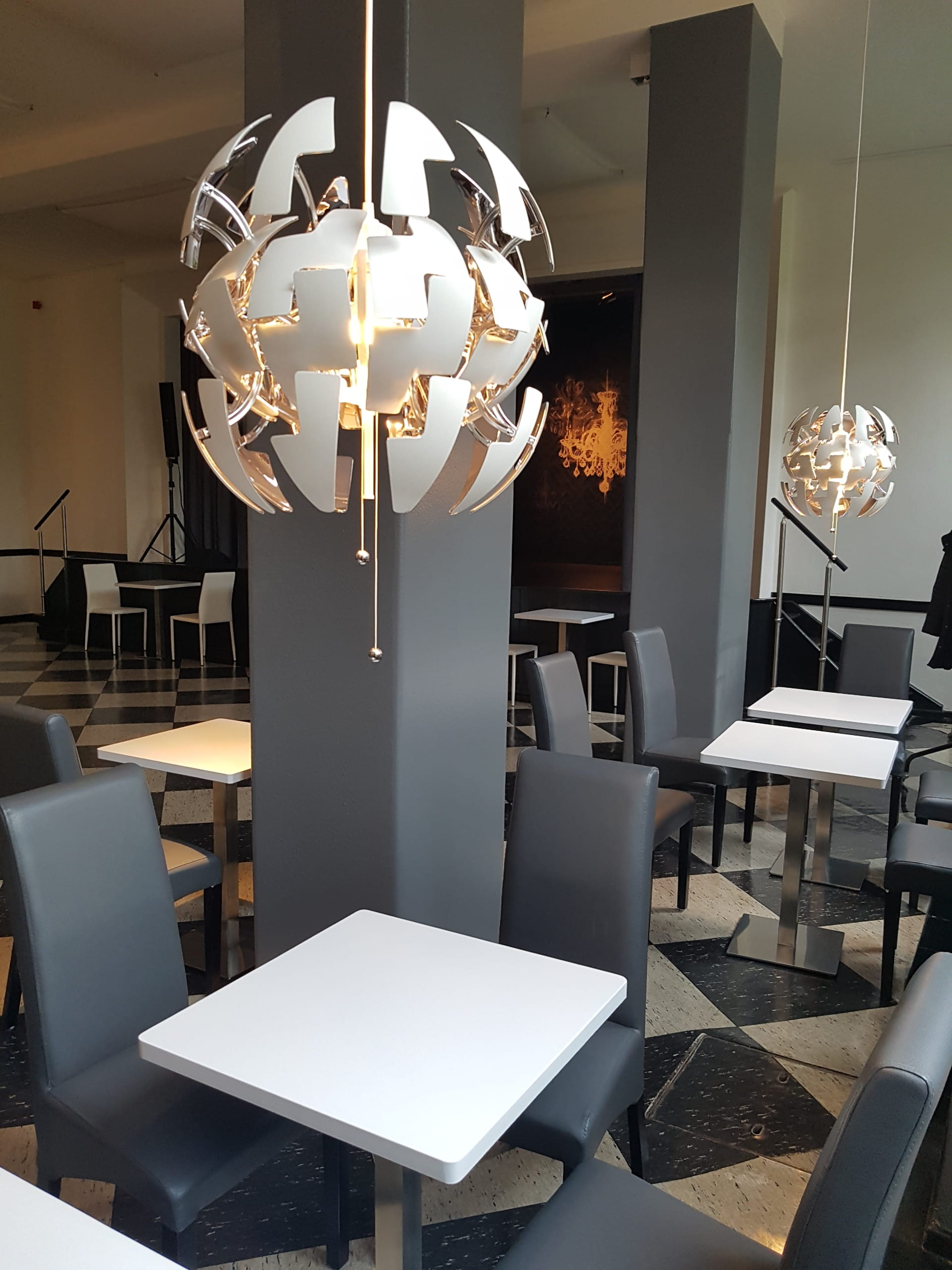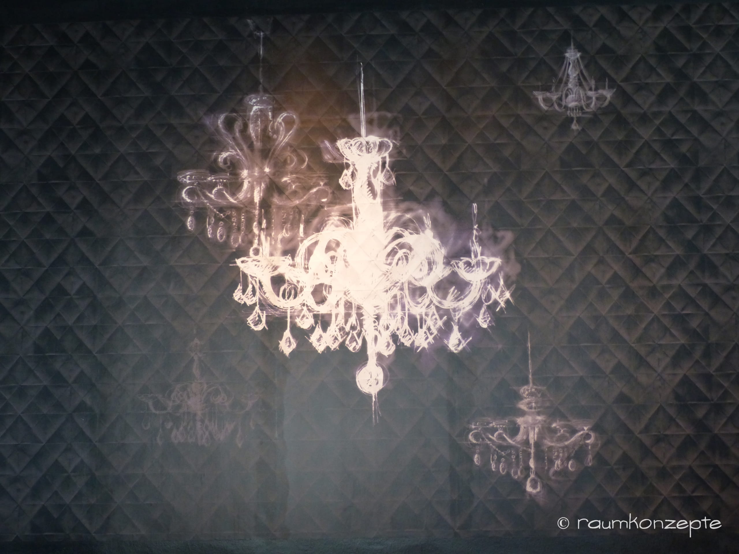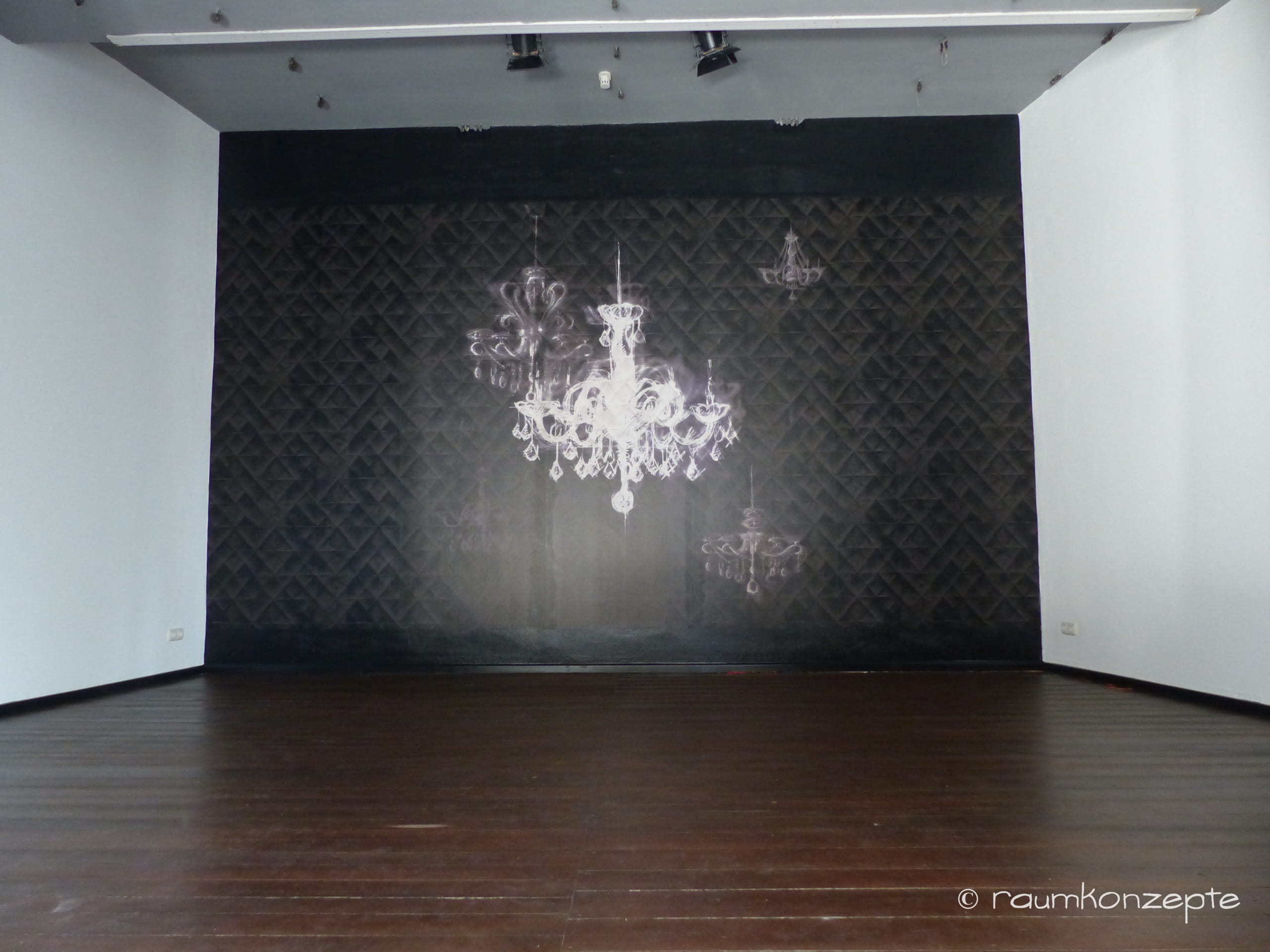 Auf schwarzem Untergrund werden von Hand verschieden große weiße Leuchter gemalt. Angestrahlt wirken sie traumhaft schön und sorgen, mit dem neuen Bühnenvorhang, für eine gewisse Opulenz. Ein schöner Kontrast zur rhythmischen Gestaltung des Raumes.