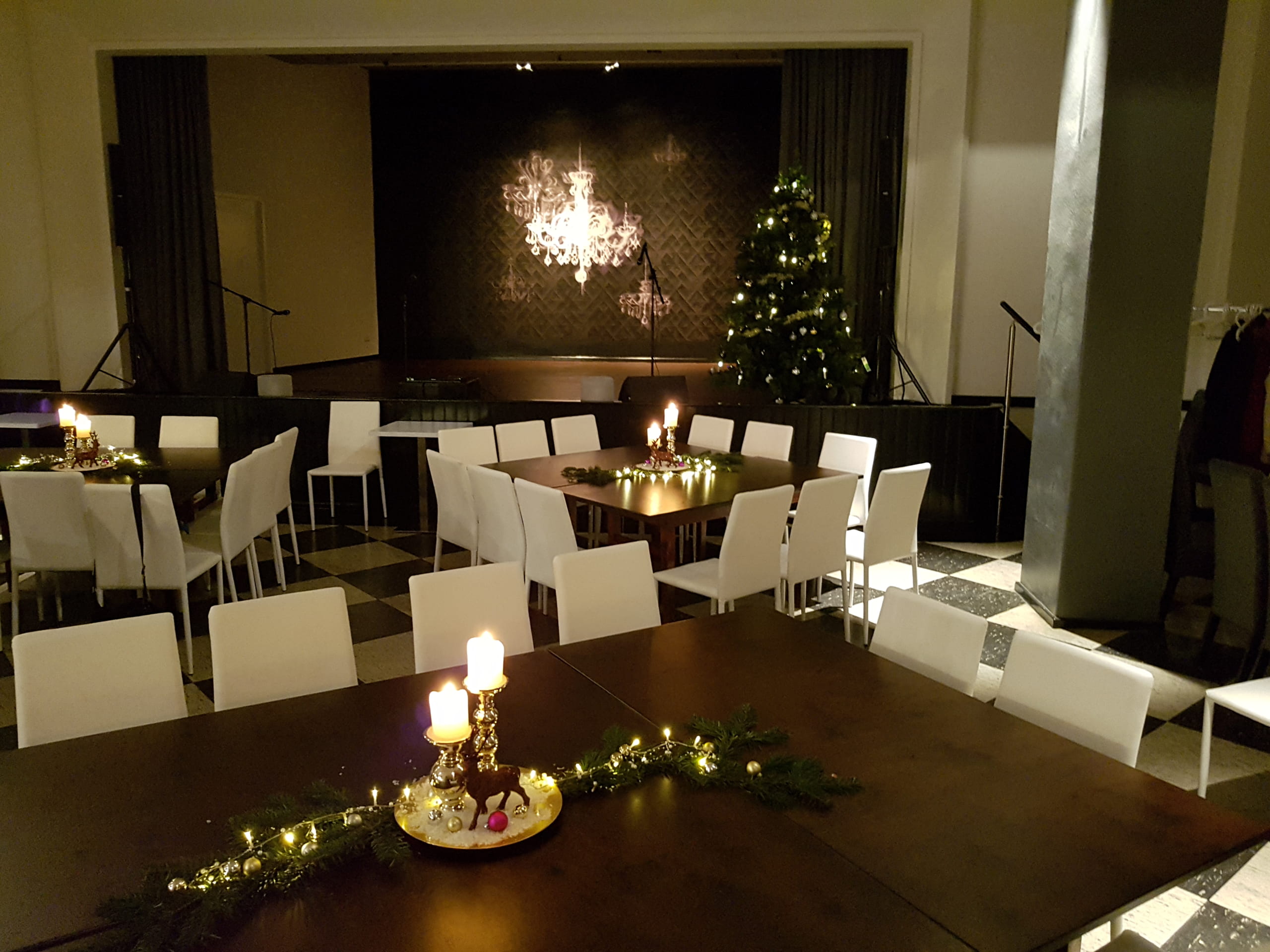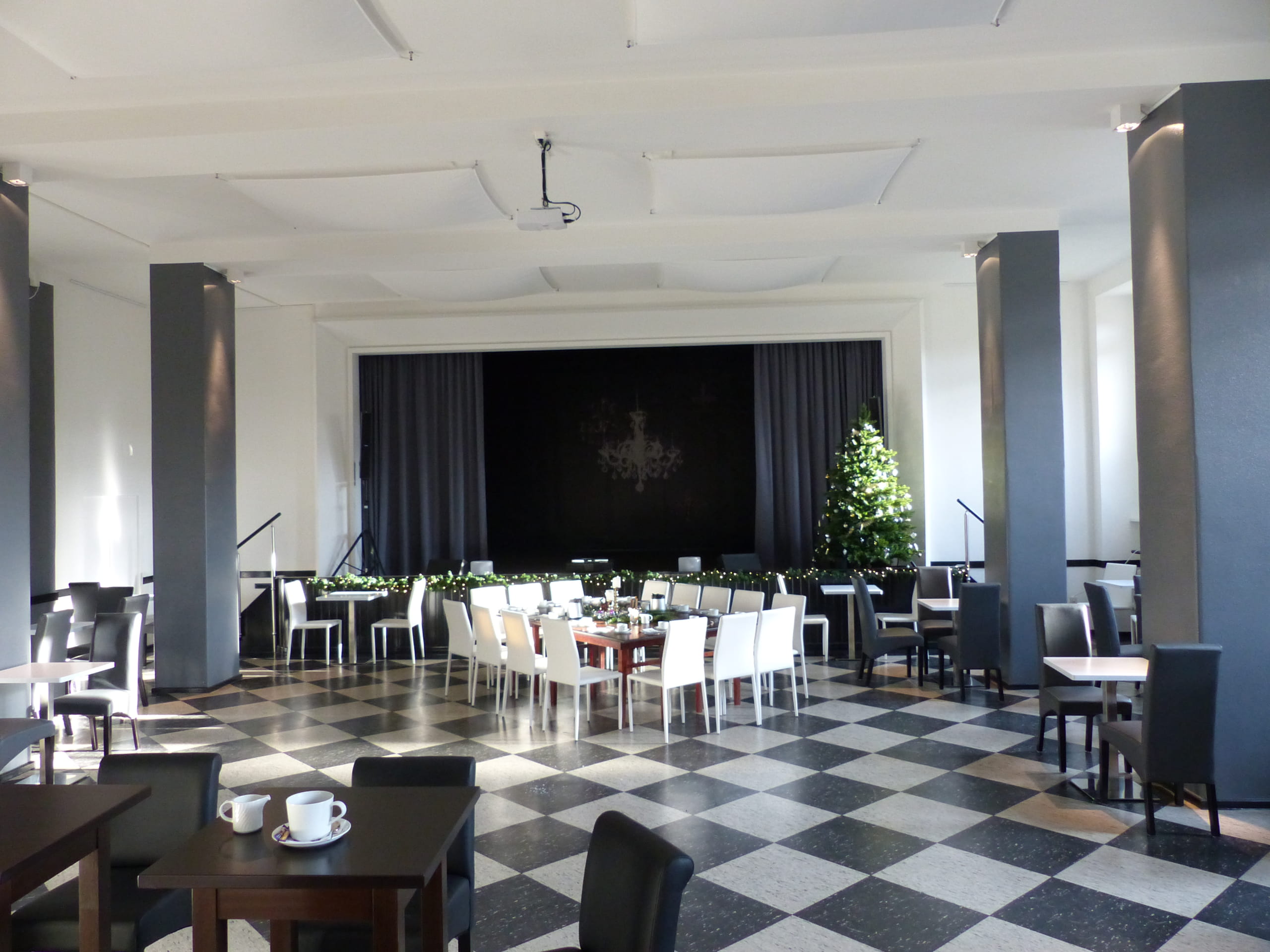 Aula Raumdeko8 nachher mit Tischdekoration und Weihnachtsbaum
