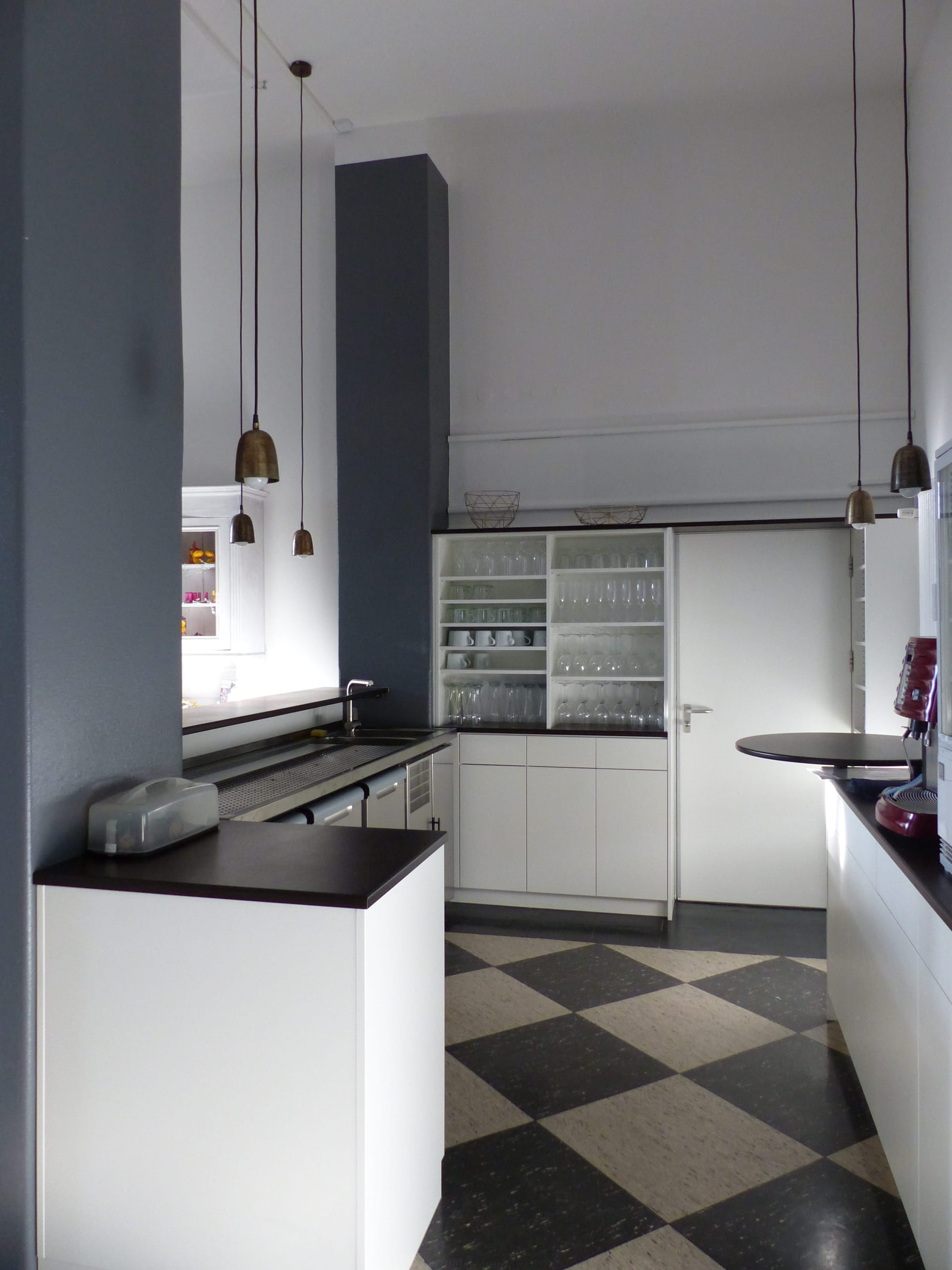 Der Eingang zur Küche wurde mit einem schönen Tresen abgetrennt, vorhandene Schränke weiß lackiert und durch weiße Einbauschränke erweitert. Gläser, Geschirr und Besteck sind so endlich griffbereit. Die tiefhängenden kleinen Messinglampen betonen die Raumhöhe.