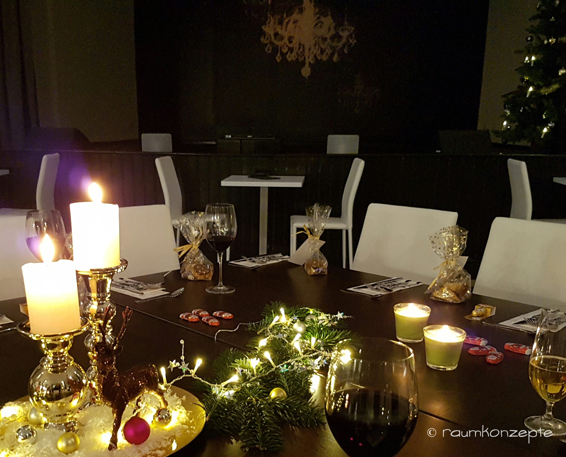 Aula Tischdeko6 nachher mit Weihnachtsdekoration und Rotwein