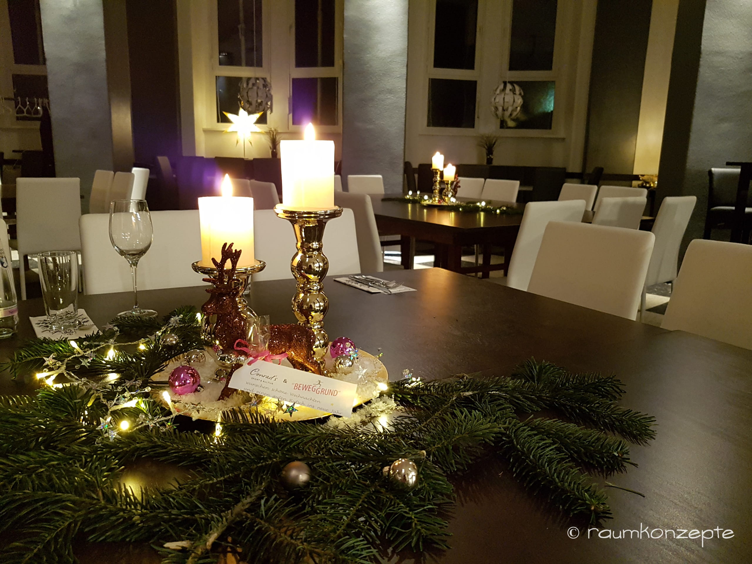Aula Tischdeko7 nachher mit Weihnachtsdekoration und Kerzen