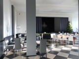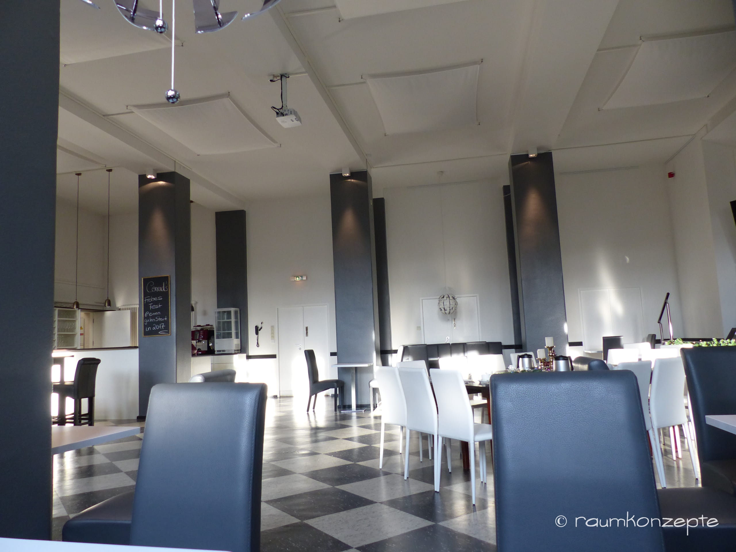 Gute und mutige Ideen waren gefragt, denn Mittel und Zeit waren begrenzt. Es sollte und brauchte nicht in die Substanz eingegriffen zu werden, da raumkonzepte sofort die Möglichkeiten des Raumes erkannte. Dadurch blieb der völlig intakte Fußbodenbelag erhalten, der Bühnenboden wurde überarbeitet und Wände und Decken wurden frisch gestrichen.