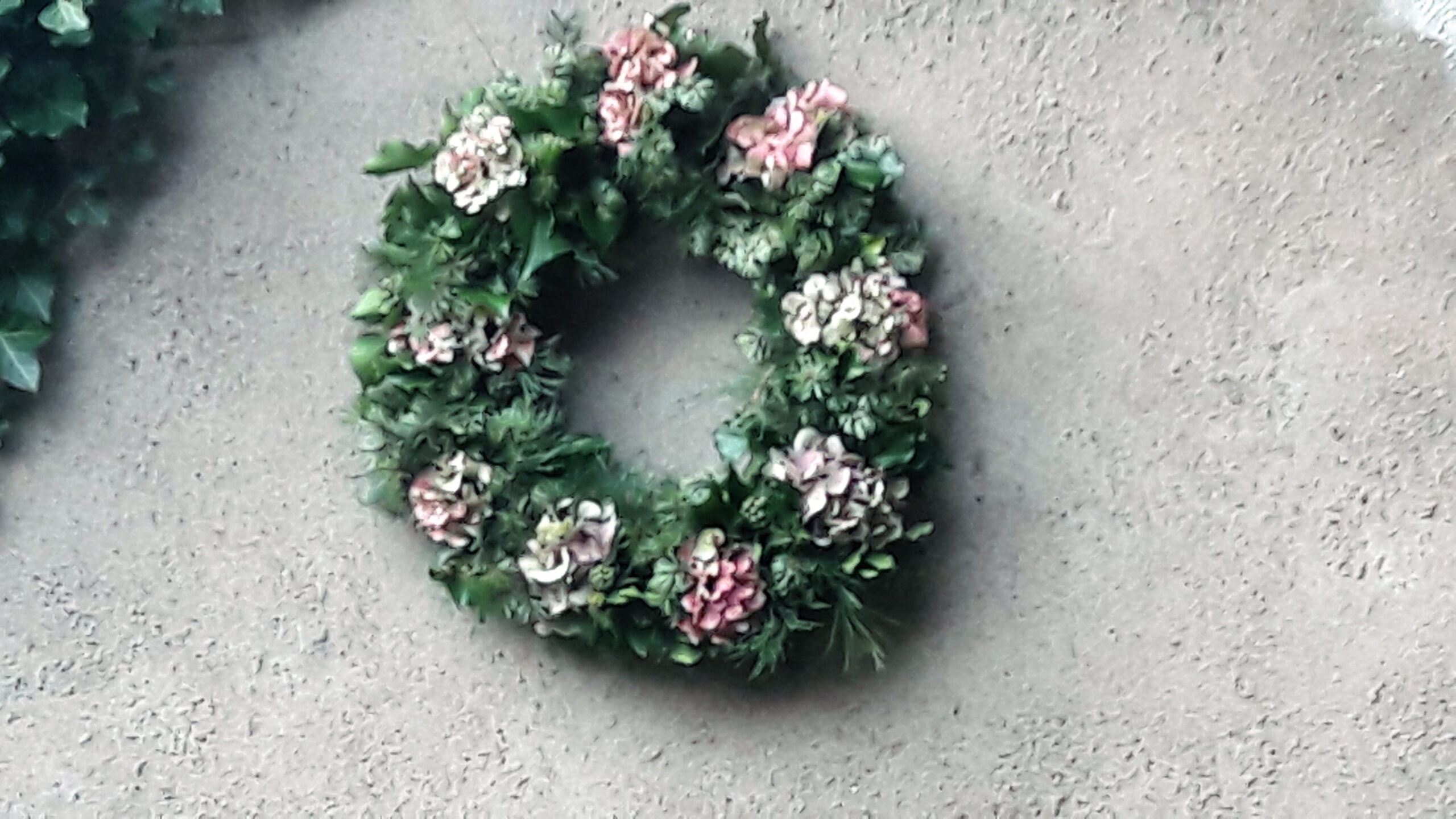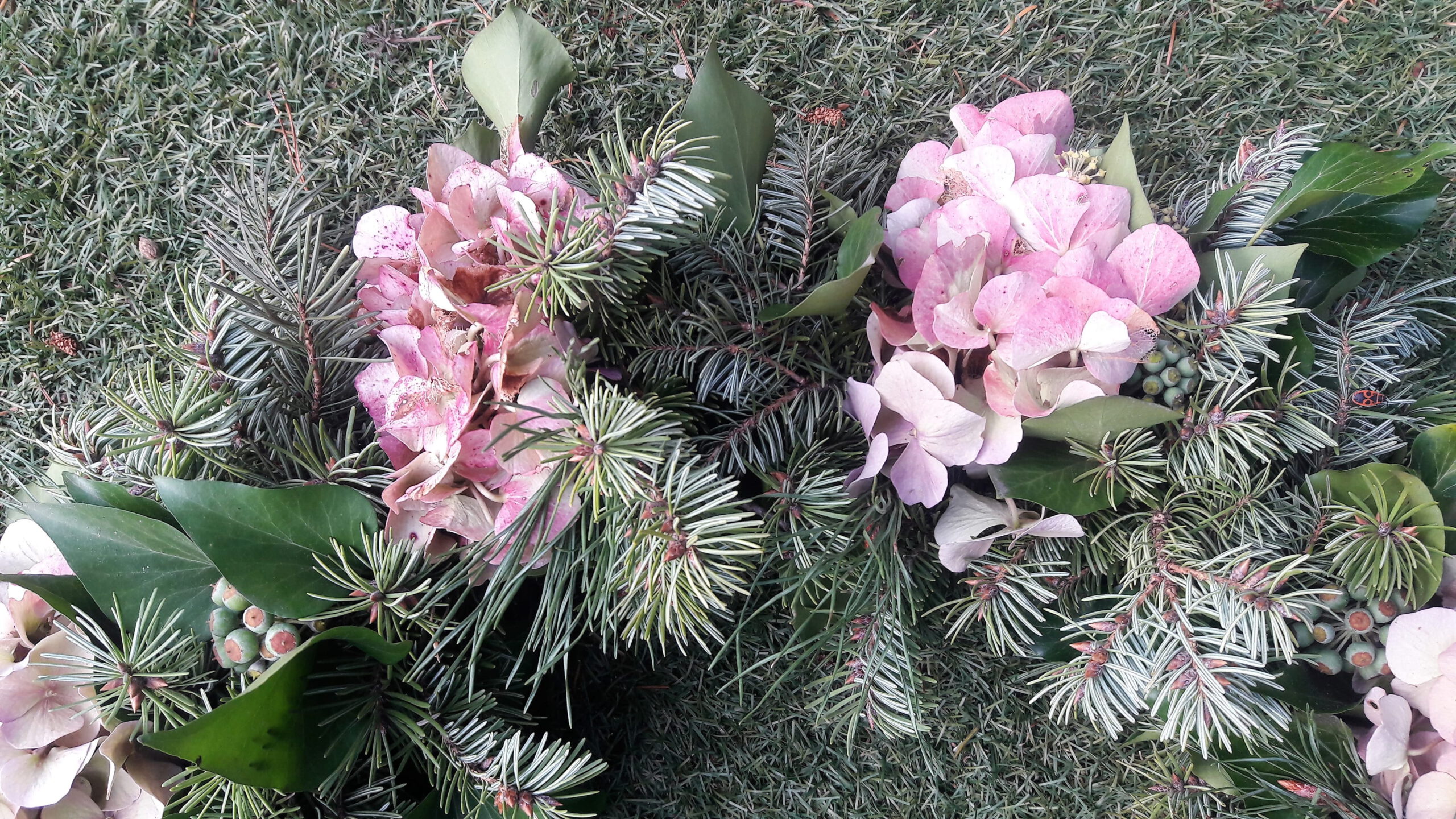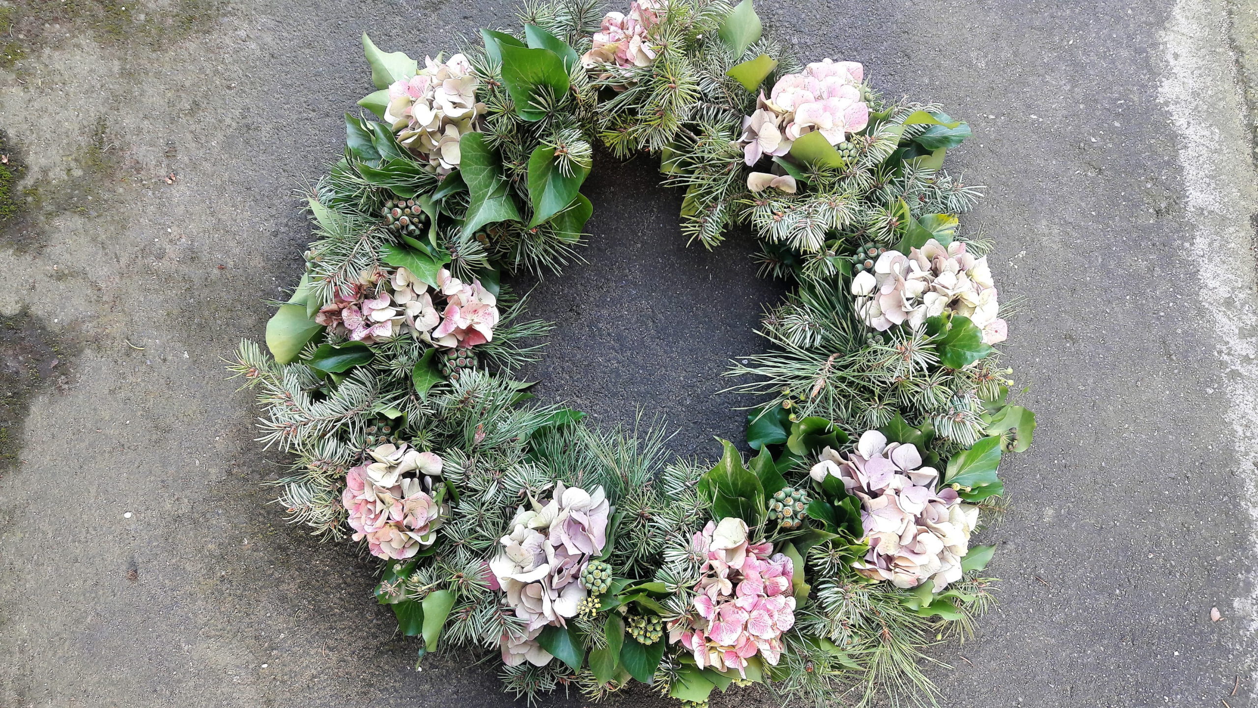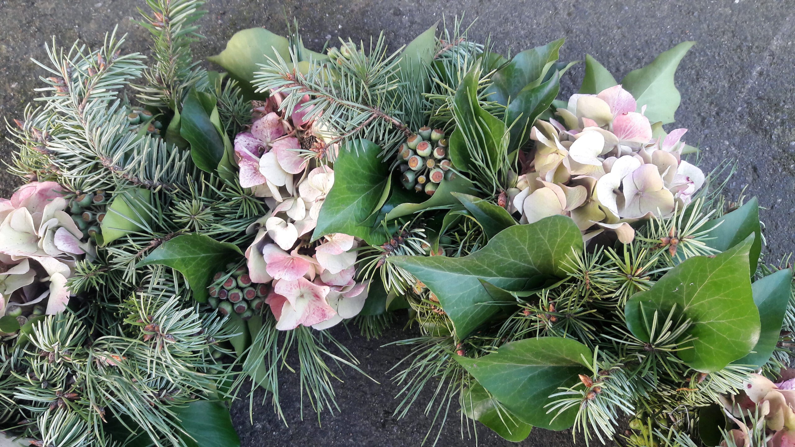 Am Ende des Sommers fallen viele Blütenstände und Zweige an, die sich wunderbar zum Gestalten eignen. Hier wurden die Samenstände und Zweige vom Efeu, verschiedene Nadelzweige und Hortensien zu einem herbstlichen Kranz gebunden. Bis zum nächsten Wechsel der Dekoration hat er den Platz an der alten Mauer bekommen.