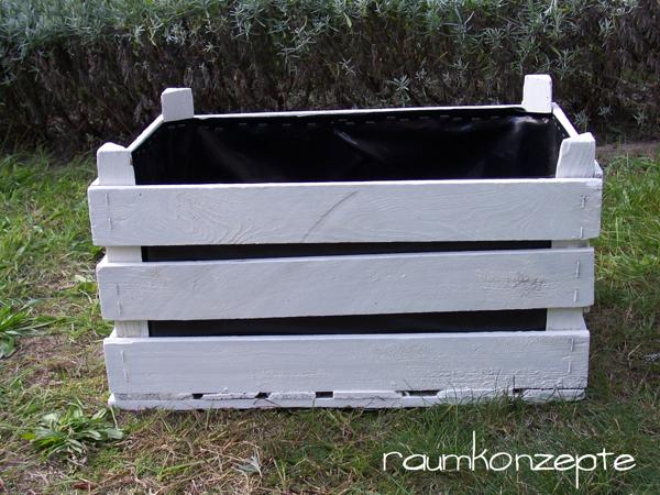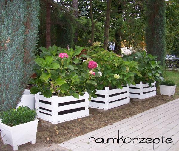 Niemand wollte sie haben, aber sie waren zu Schade zum entsorgen, die “drei alten Obstkisten”. Die Idee: individuelle Pflanzkübel. Einfach mit weißer Farbe streichen, dann Teichfolie passend zuschneiden und mit dem Tacker befestigen. Zur Entwässerung unten ca. 20 Löcher einstechen. Eine Schicht Blähton (5cm) dient als Drainage und das Flies darüber schützt vor der Pflanzerde. Bei der Pflanzenauswahl den Standort beachten. Hier ist es ein schattiger Platz deshalb sind es diese üppigen Bauernhortensien geworden, die bis in den Herbst hinein blühen.