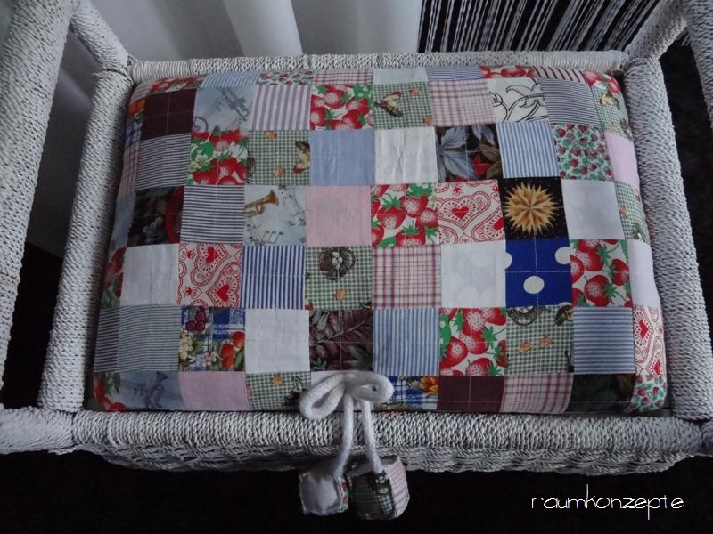 Wieder so ein hässliches Entlein, dass seine Tage auf dem Boden eines alten Bauernhauses fristete. Alte Dinge sind meine Leidenschaft und deshalb habe ich sie gerettet. Mit weißer Farbe und einem bunten Stoff wurde zu neuem Leben erweckt. Der Bezug wurde aus vielen kleinen Quadtraten alter Stoffreste geschnitten. Zusammengenäht und auf eine Unterlage gesteppt ergibt sich diese bunte Kreation. Patchworkkurse: im Nähkontor. Die Bommeln sind aus den selben kleinen Quadraten wie Würfel zusammengenäht und mit Watteline gefüllt. Die weiße Schleife entstand mit der Stricklisel aus einem Rest alter Wolle. Und schon ist das Redesign einer alten Truhe perfekt. Alle Teile sind alt und haben mit ein wenig Phantasie und handwerklichem Geschick ein nettes Möbelstück wieder entstehen lassen. In einem Kinderzimmer würden sicher viele Spielsachen darin einen Platz finden.
