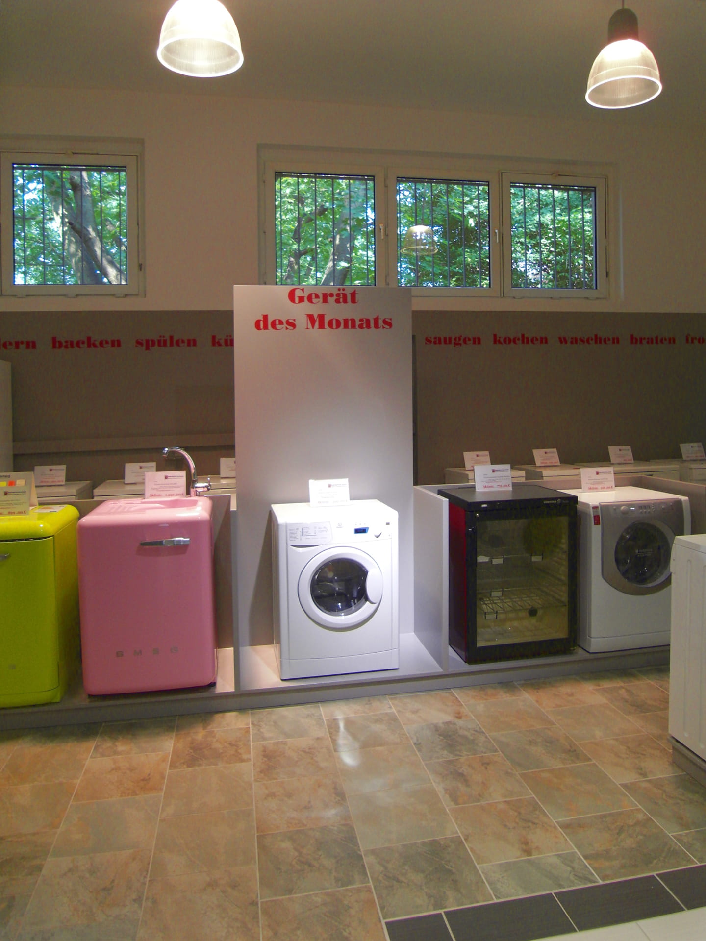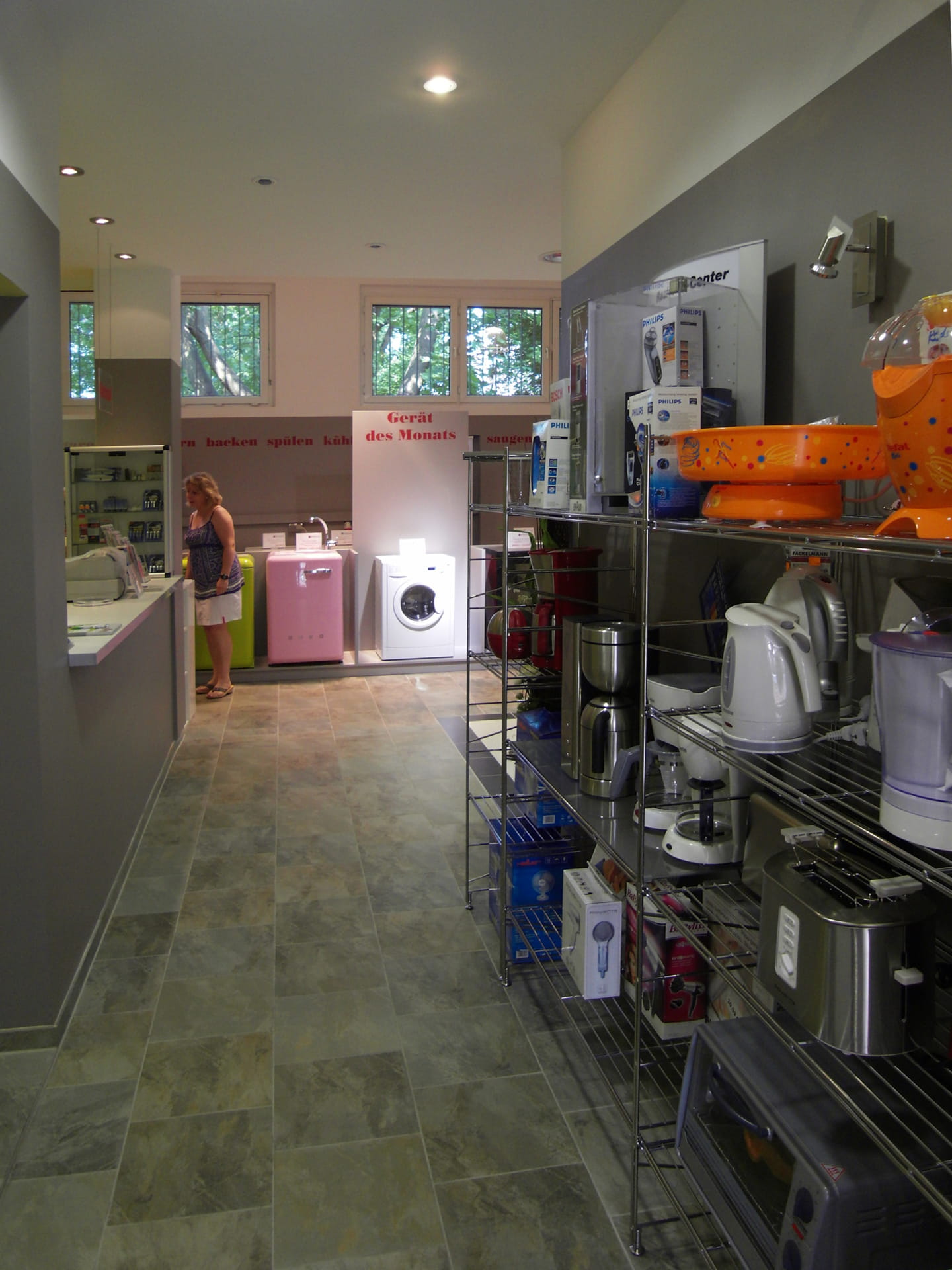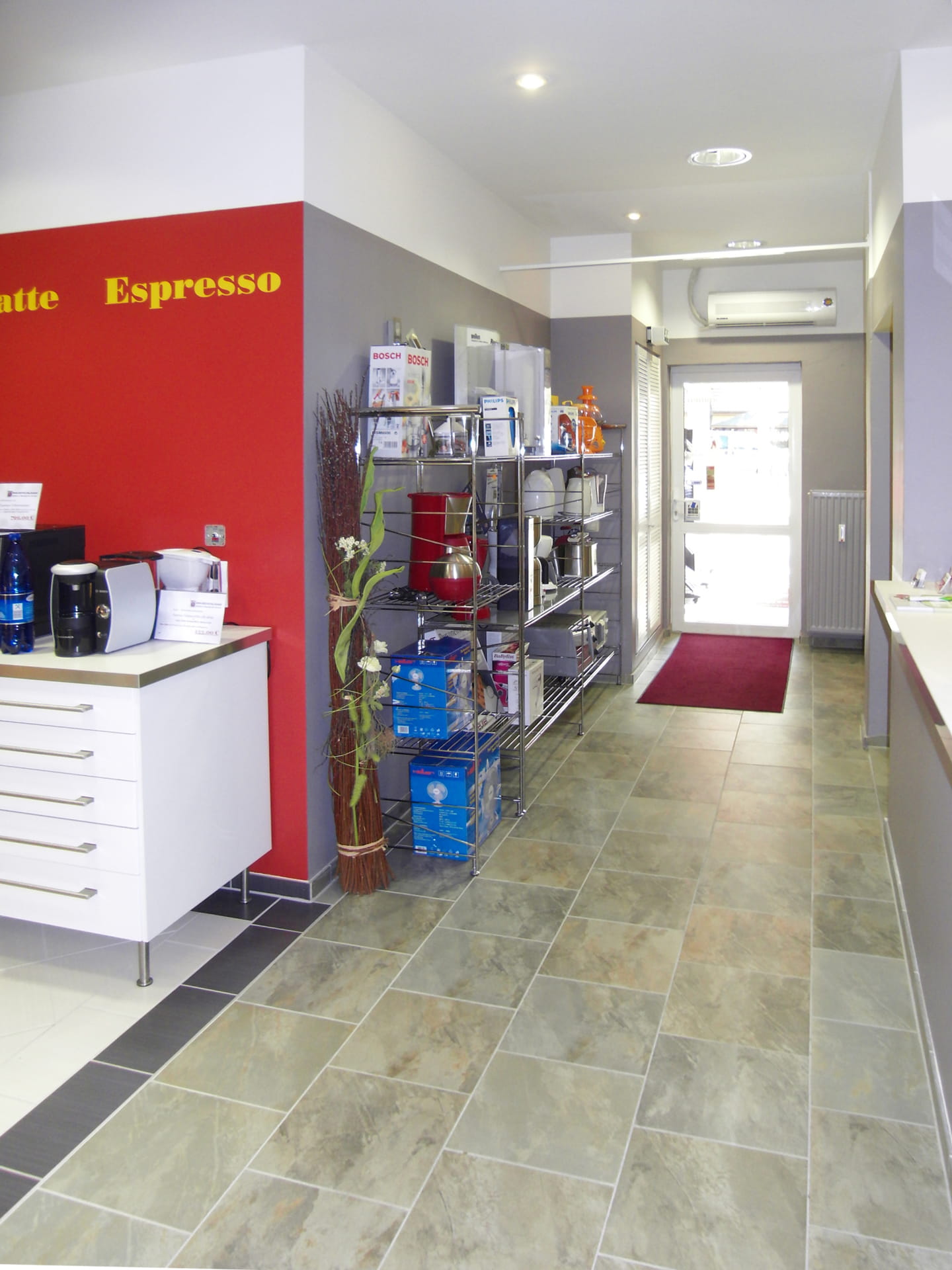 In der alten Fabrikhalle in Köpenick sollte der Verkaufsraum für Haushaltgeräte erweitert werden. In diesem Zusammenhang wurde die gesamte Fläche kundenfreundlich organisiert. Durch das neue Farb- und Gestaltungskonzept wirkt die Verkaufsfläche klar und strukturiert. Beratungen werden jetzt in einem separaten Bereich durchgeführt. Die weiße Küchenzeile dient nicht nur der Präsentation hochwertiger Kaffeeautomaten, es darf auch verkostet werden! Grau und Rot geben den Ton an und bilden einen schönen Hintergrund für die Präsentation die Haushaltgeräte. Die farbigen Wandflächen nehmen dem Raum die Höhe und der Schrift-Fries verbindet die einzelnen Elemente miteinander. Neue Preisschilder, Hinweisschilder und Straßenaufsteller wurden im Gestaltungskonzept berücksichtigt. Das sagt Firma Repschläger zum Konzept.