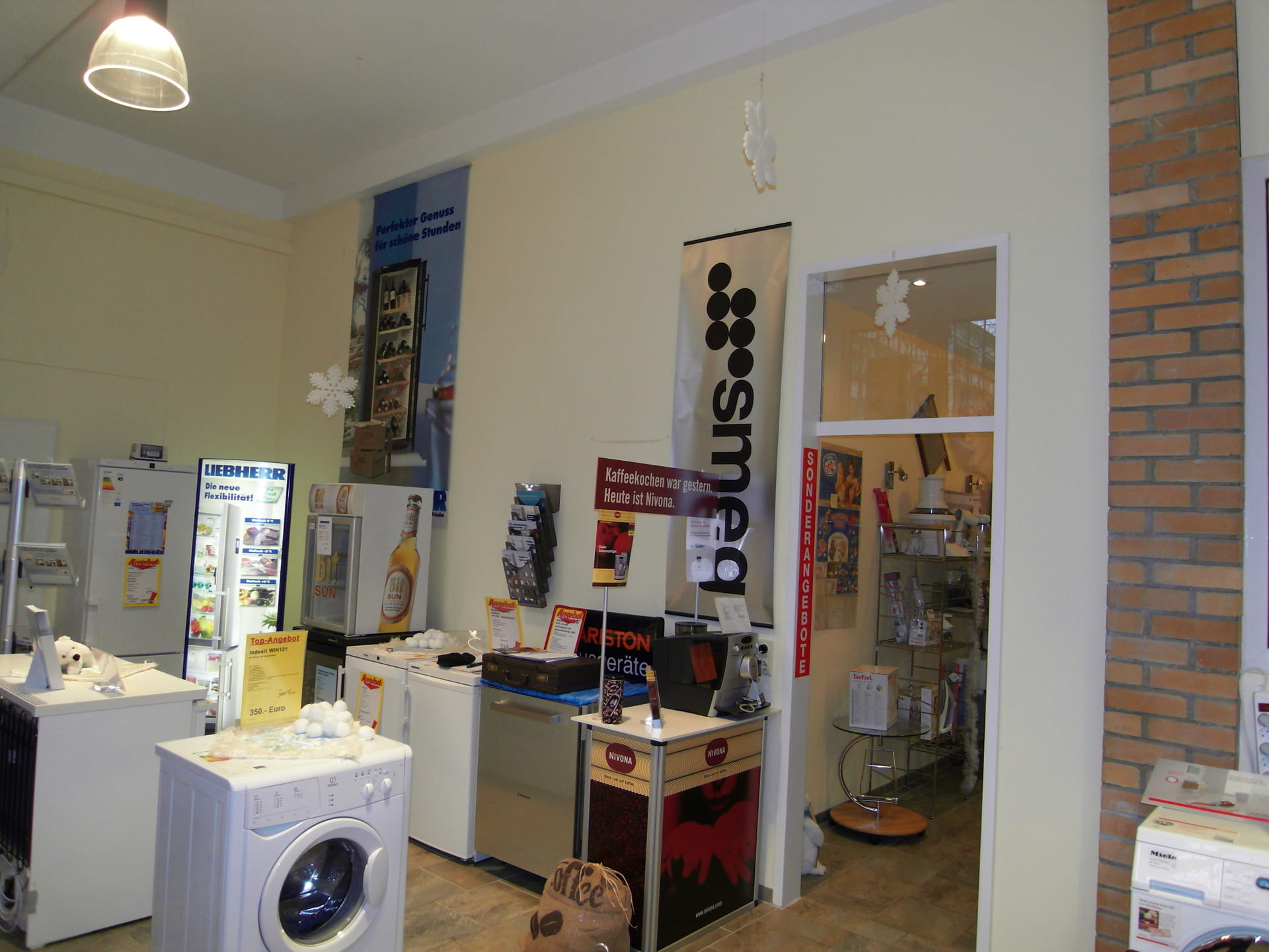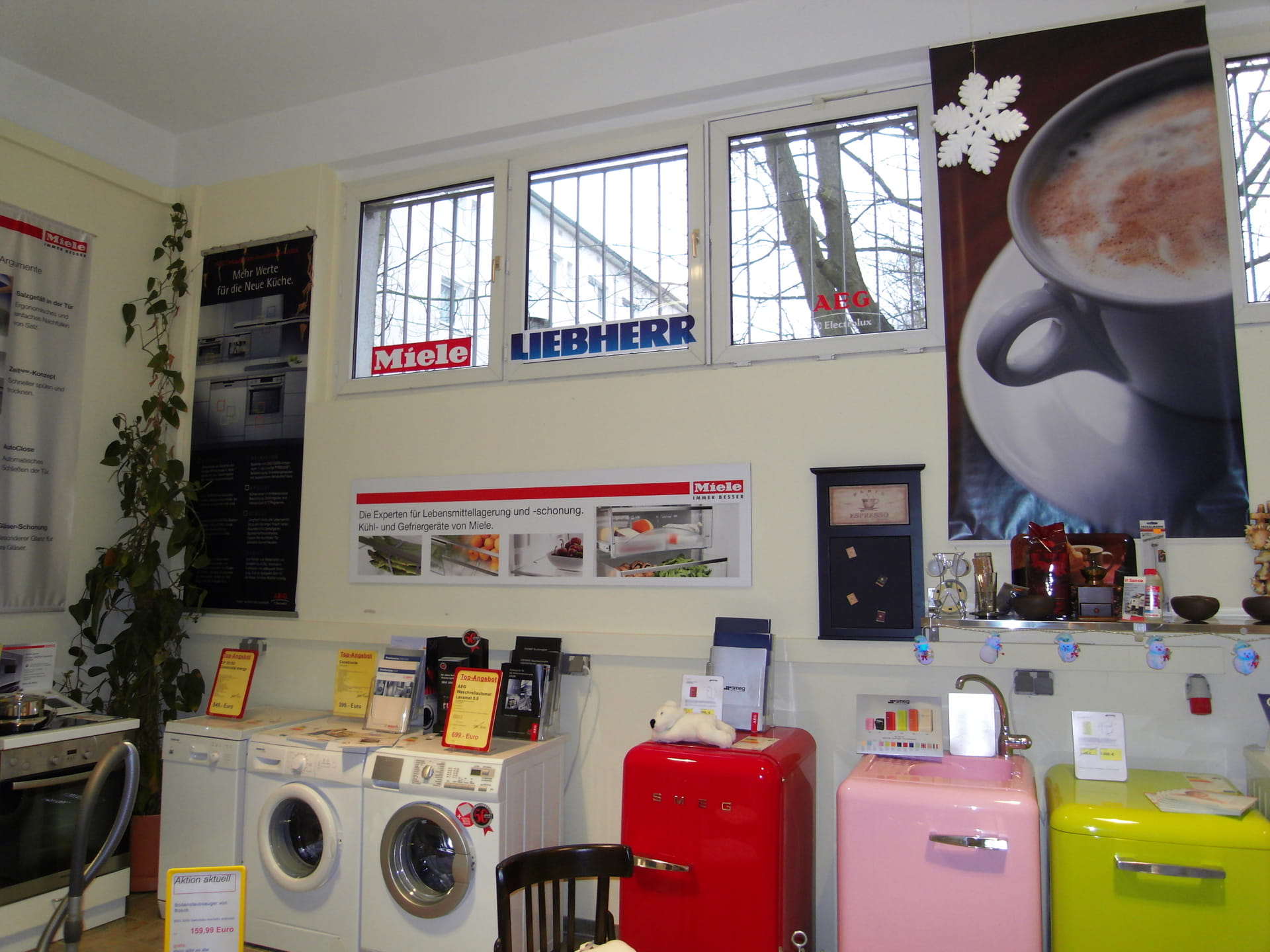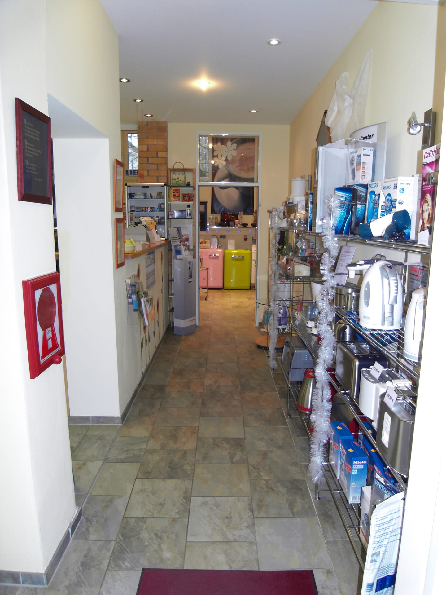 In der alten Fabrikhalle in Köpenick sollte der Verkaufsraum für Haushaltgeräte erweitert werden. In diesem Zusammenhang wurde die gesamte Fläche kundenfreundlich organisiert. Durch das neue Farb- und Gestaltungskonzept wirkt die Verkaufsfläche klar und strukturiert. Beratungen werden jetzt in einem separaten Bereich durchgeführt. Die weiße Küchenzeile dient nicht nur der Präsentation hochwertiger Kaffeeautomaten, es darf auch verkostet werden! Grau und Rot geben den Ton an und bilden einen schönen Hintergrund für die Präsentation die Haushaltgeräte. Die farbigen Wandflächen nehmen dem Raum die Höhe und der Schrift-Fries verbindet die einzelnen Elemente miteinander. Neue Preisschilder, Hinweisschilder und Straßenaufsteller wurden im Gestaltungskonzept berücksichtigt. Das sagt Firma Repschläger zum Konzept.