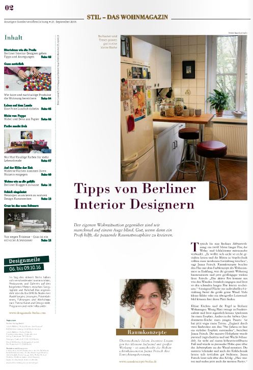 In der Beilage “Stil” der Berliner Zeitung bin ich als Einrichtungsberaterin auf Seite 2 und 5 zu Wort gekommen. Wer die gesamte Beilage lesen möchte kann hier die Sonderbeilage als PDF öffnen.