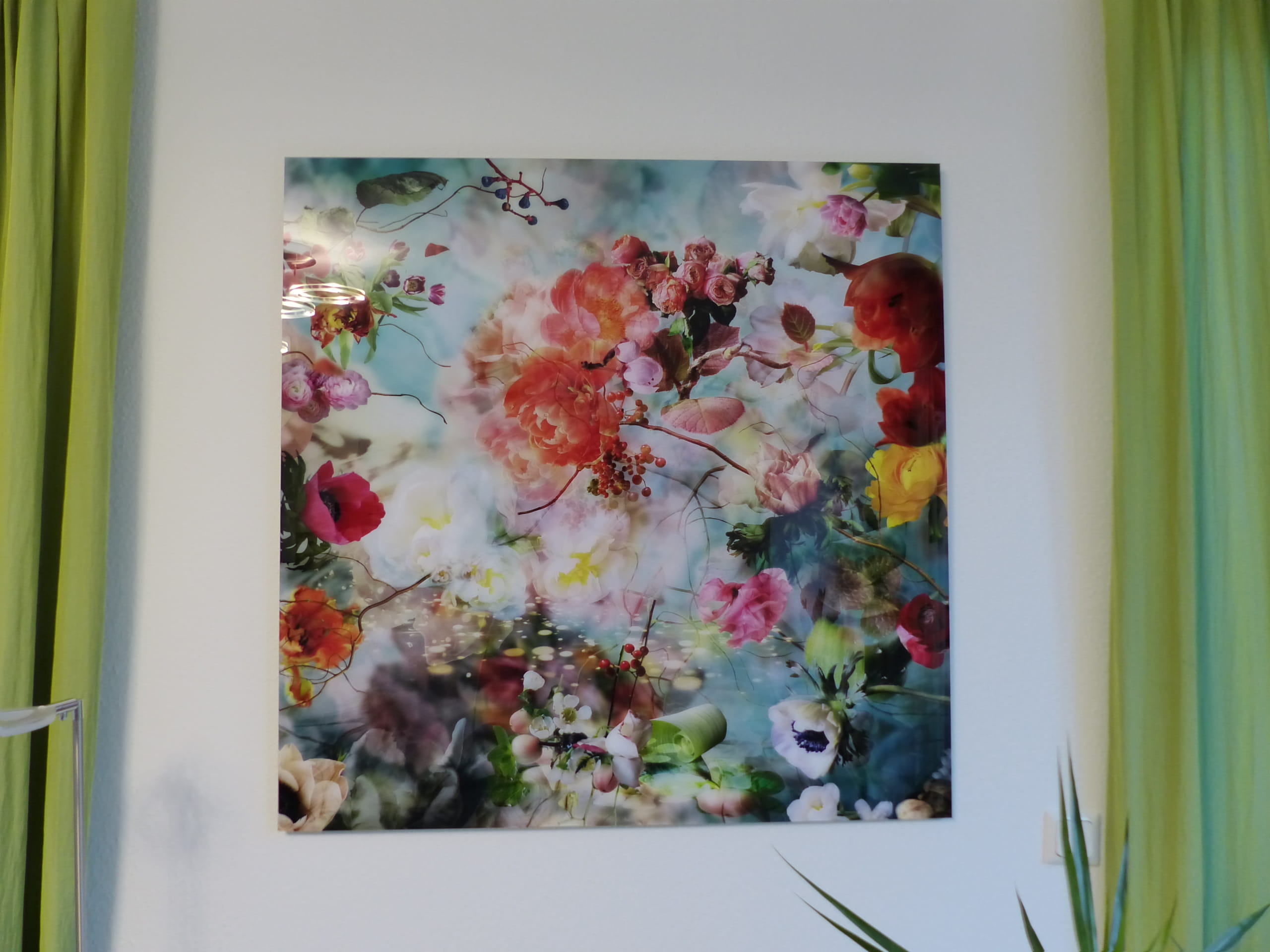 Der schöne helle Raum mit seinen vielen Fenstern bot nur eine Wand für ein solch farbenfreudiges Kunstwerk. Die Farbe der Vorhänge wurde auf eine Farbe des Bildes abgestimmt. So entsteht Harmonie! „Wir wären nie auf die Idee mit dem großen Bild an diese Stelle gekommen, aber es ist einfach wunderschön.“