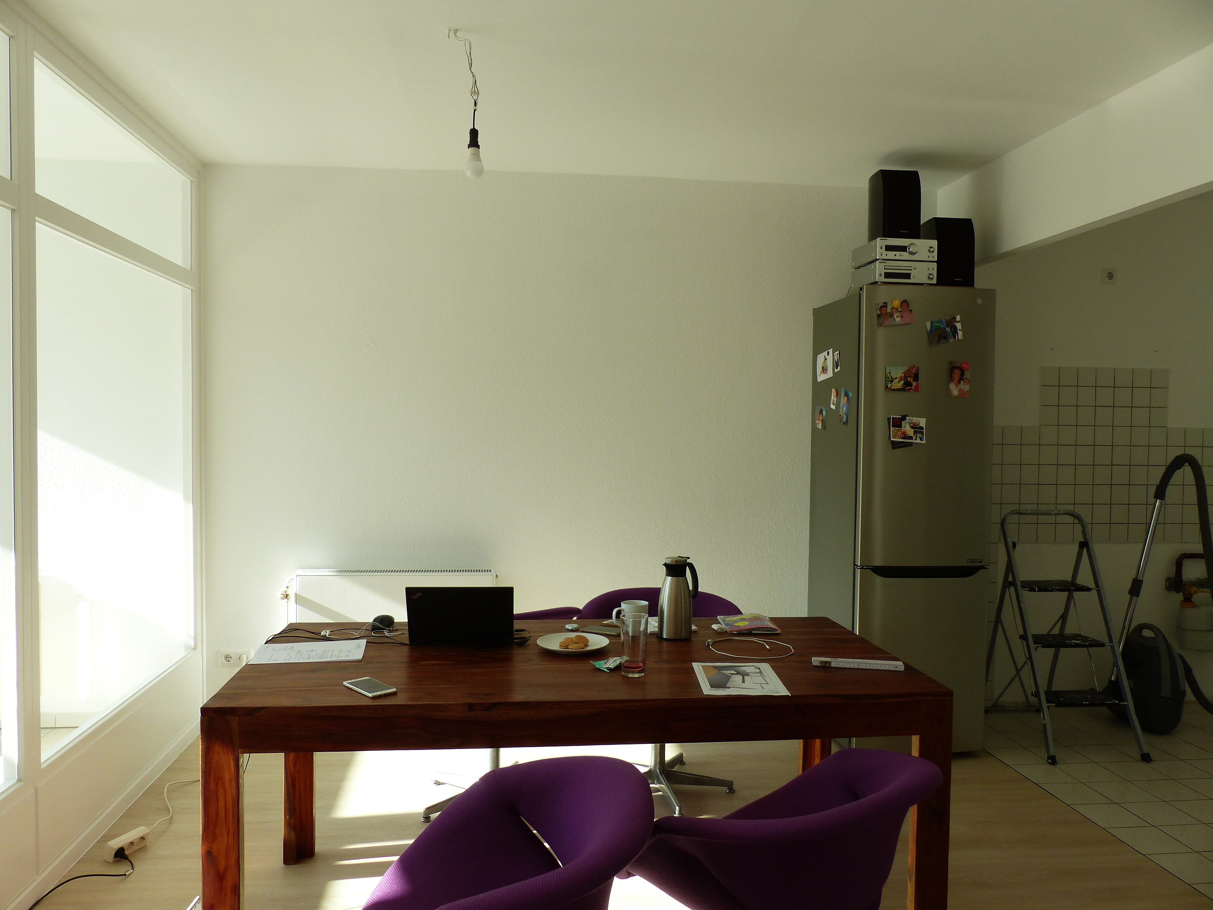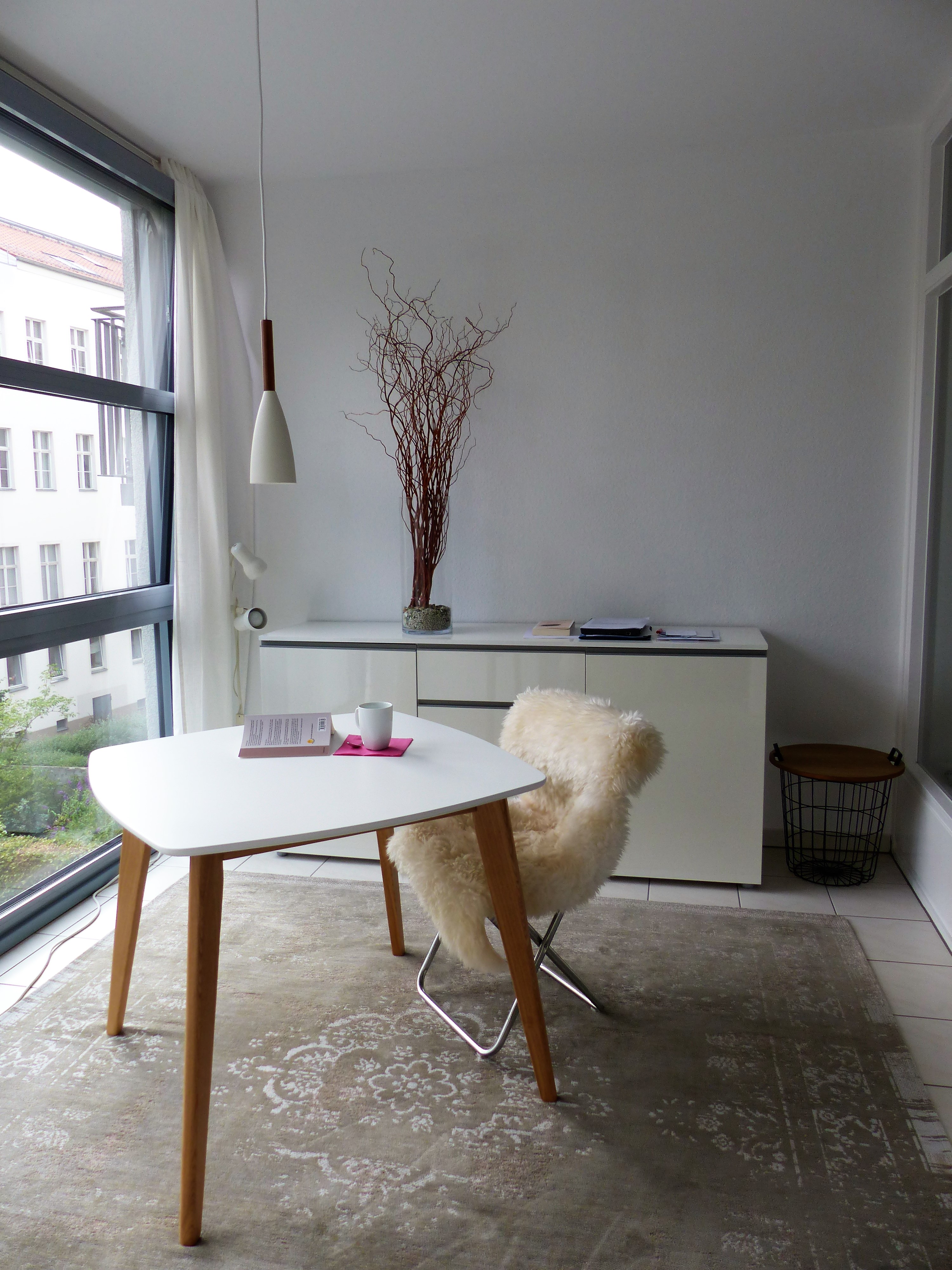 Das weiße Sidboard aus dem Wohnzimmer wird zum HomeOfficeSchrank. Am Tisch kann gearbeitet aber auch gegessen werden.