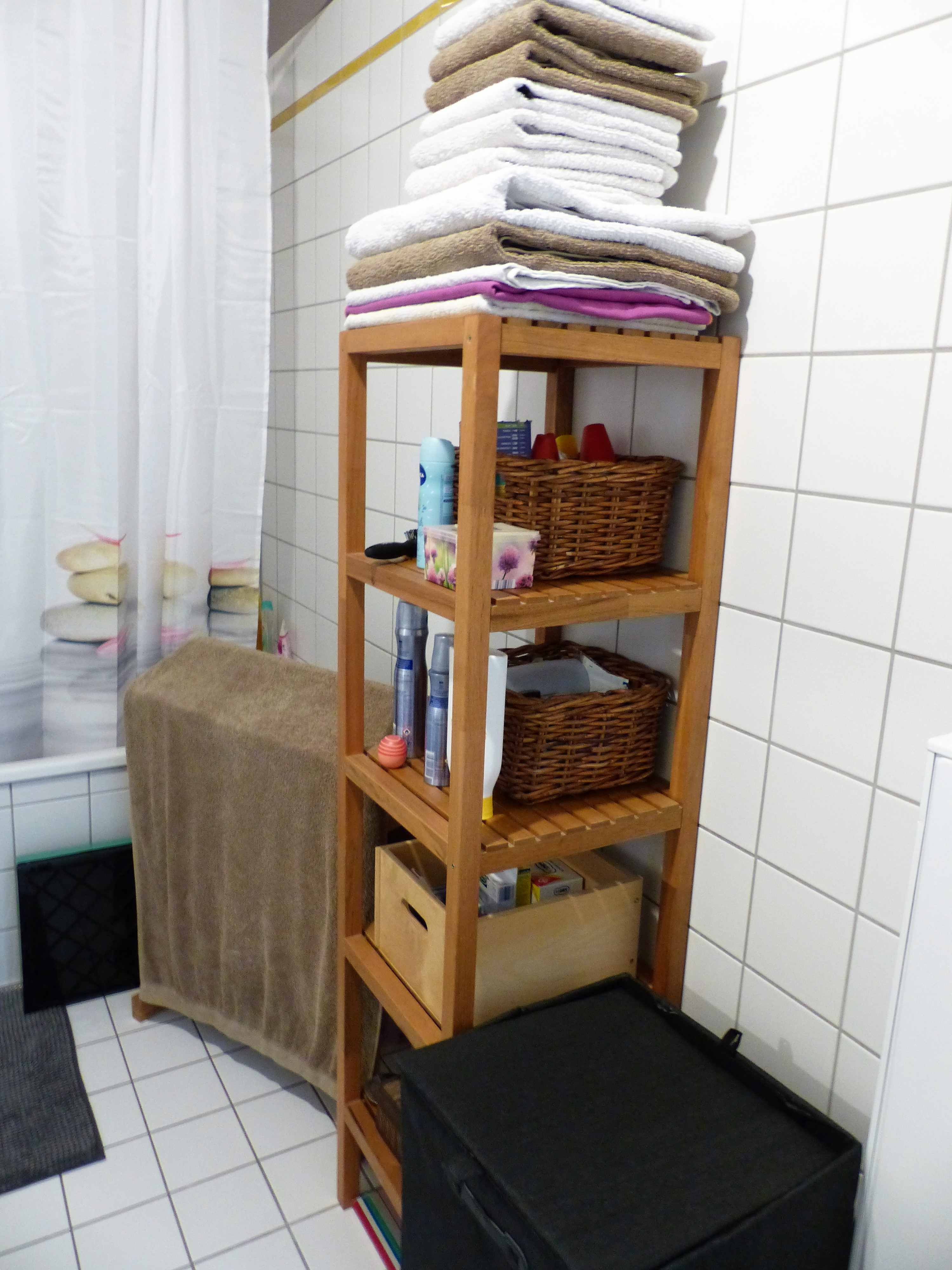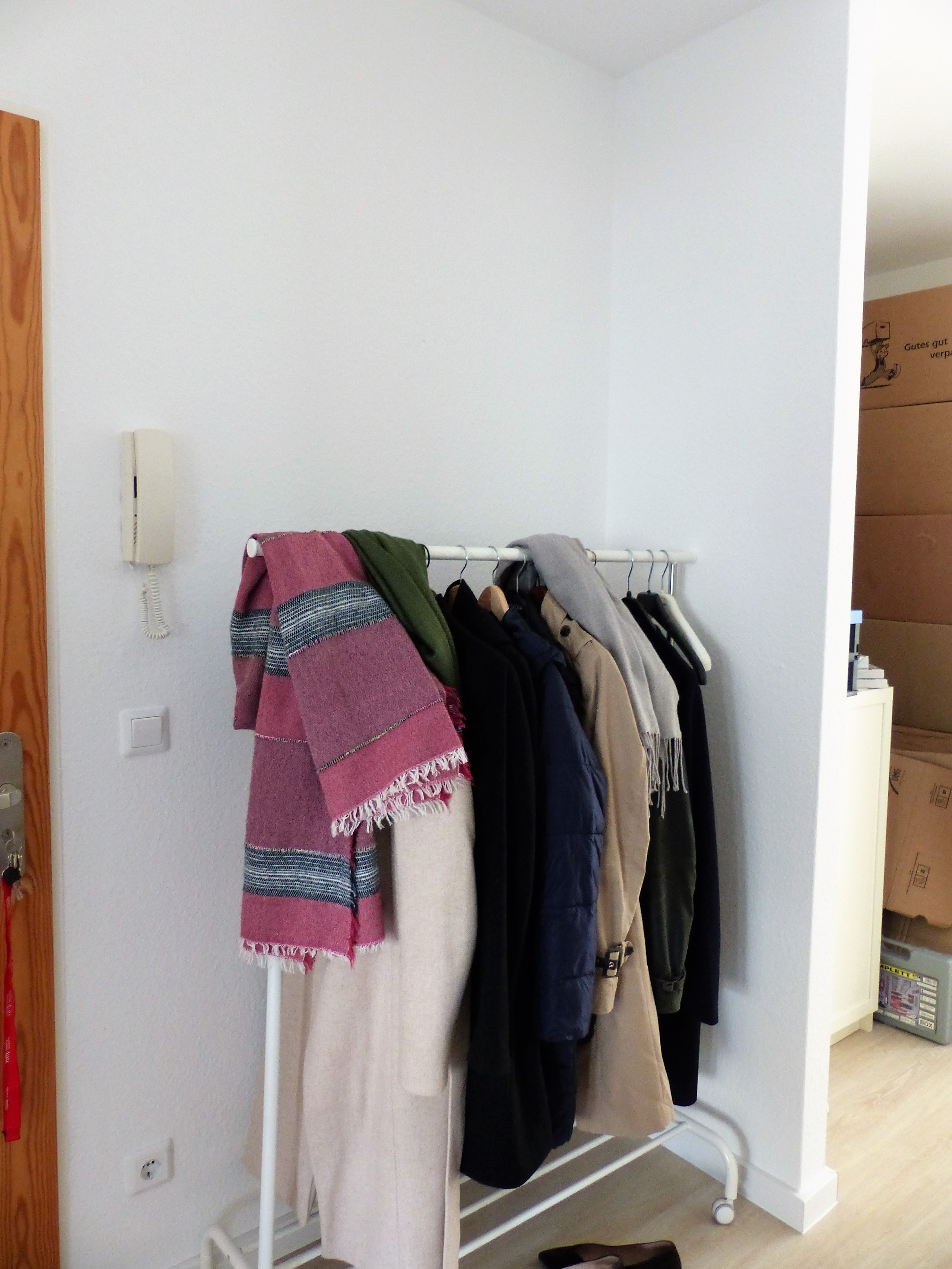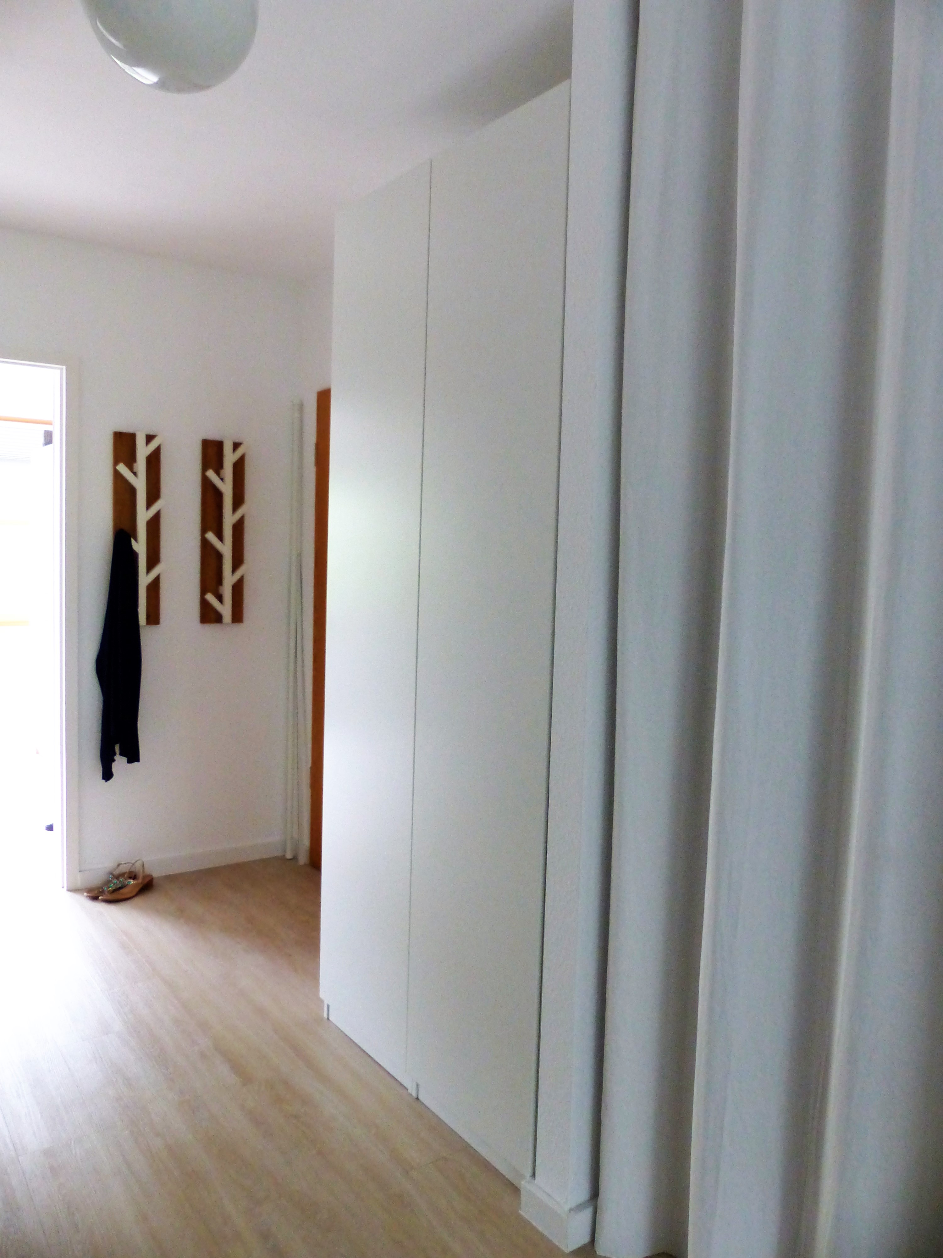 Die neue Garderobe ist jetzt ein weißer hoher Kleiderschrank, mit Stange und Schüben für Schals und Co.