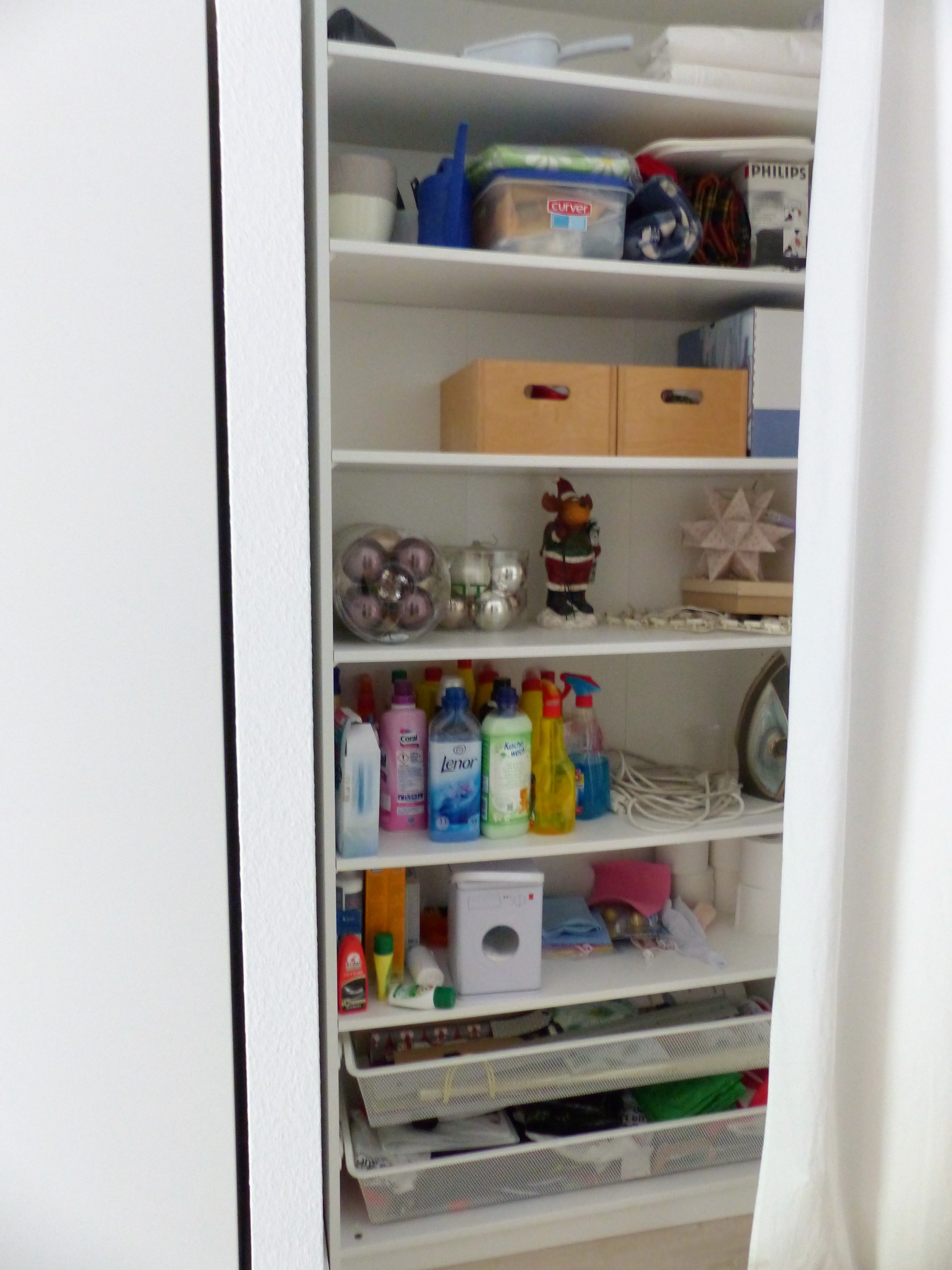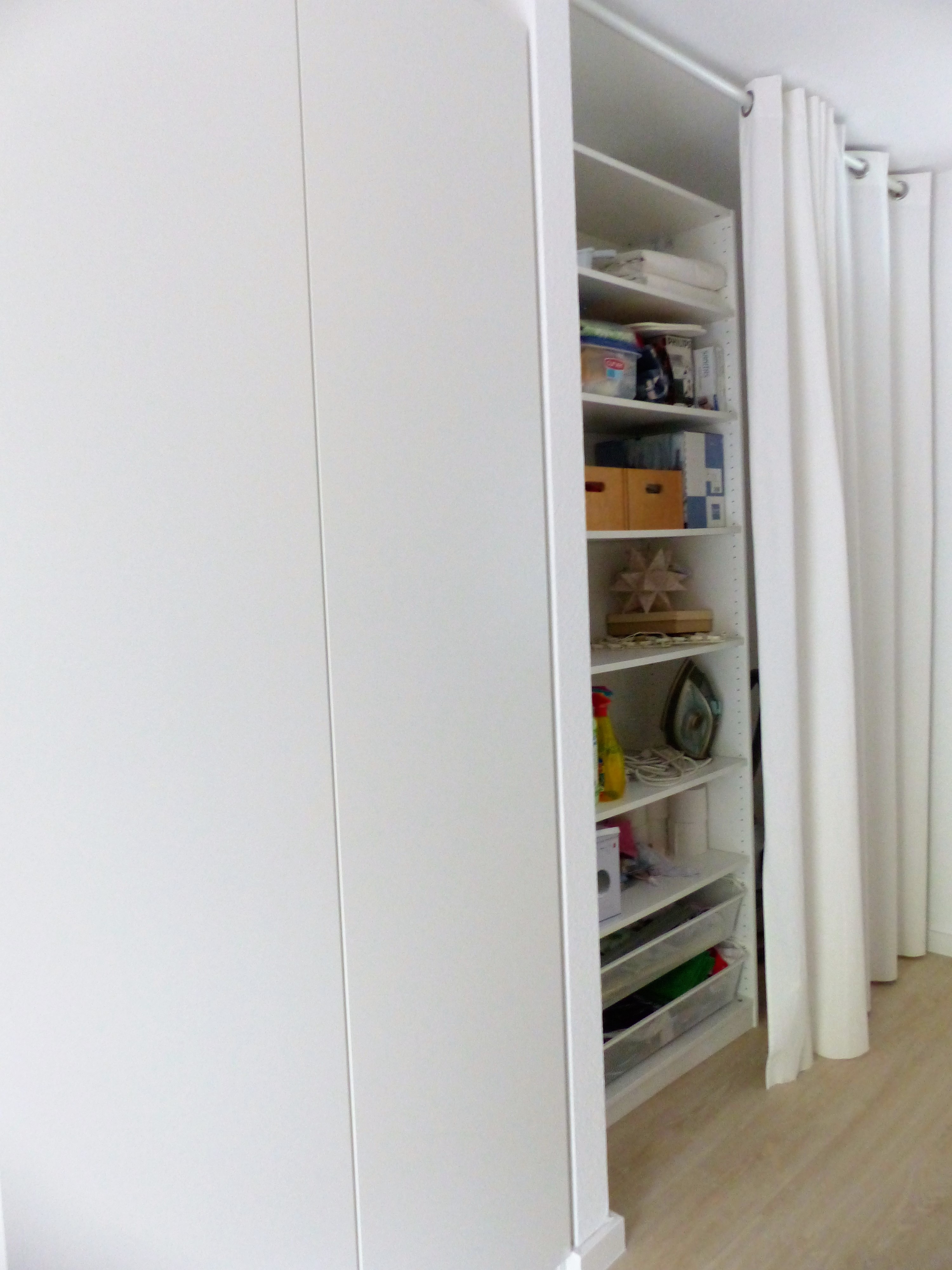 Daneben steht ein weiterer Kleiderschrank in 40 cm Tiefe. Diesmal ohne Türen, denn hinter dem Vorhang befindet sich die kleine Abstellkammer für Staubi und Co.