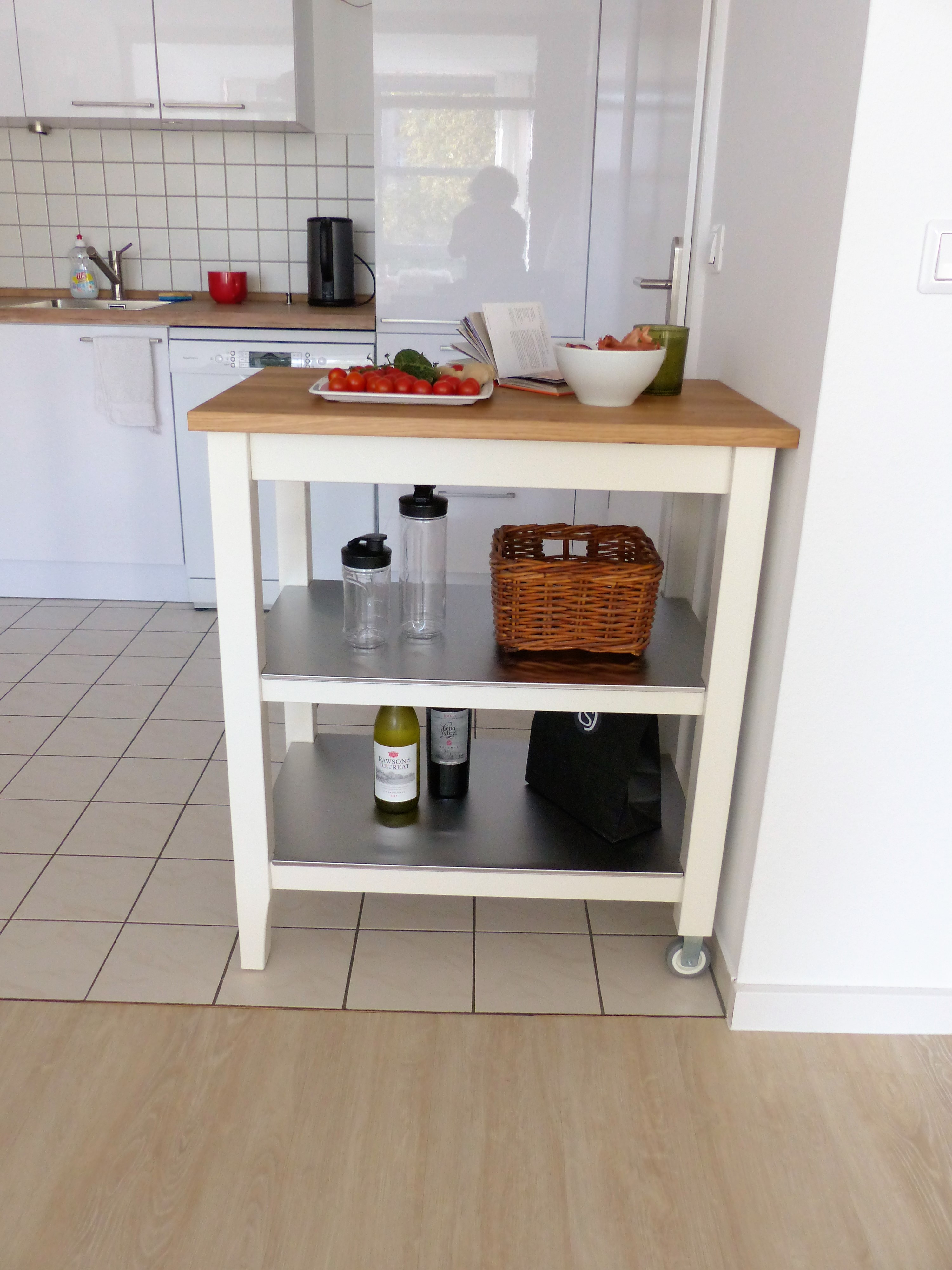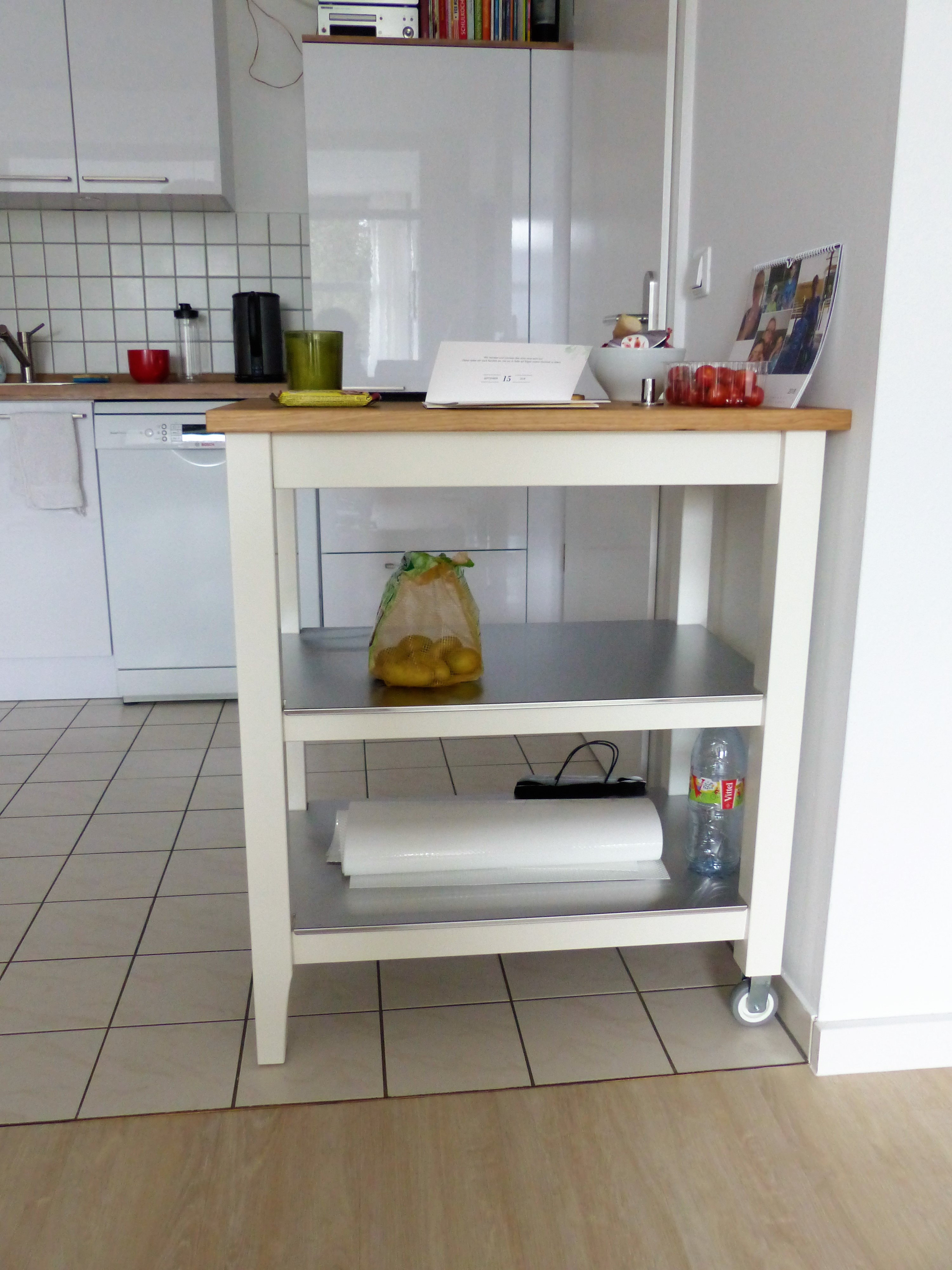Nach professioneller Dekoration – er bietet Platz für Obst und Gemüse und einige Weinflaschen, schon besser