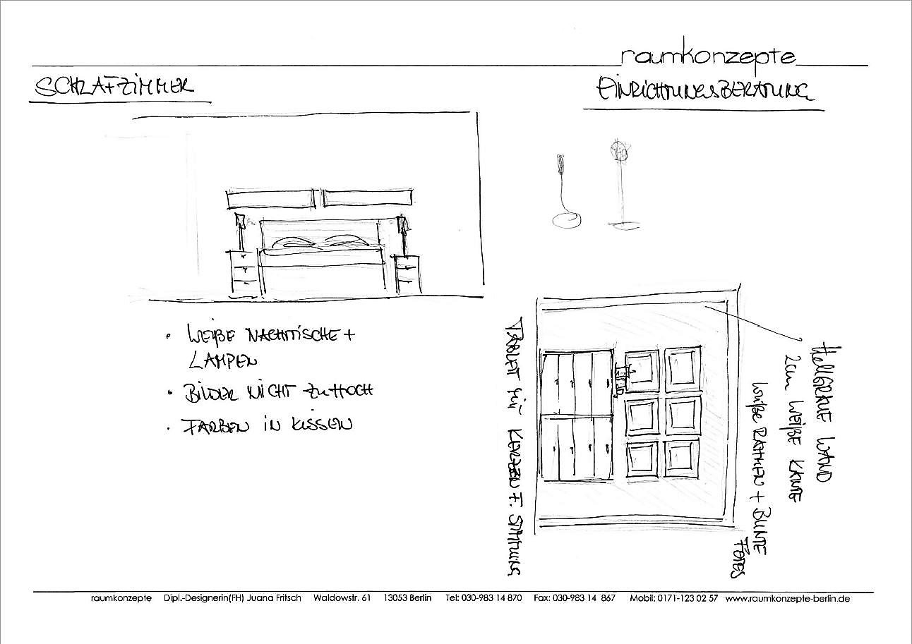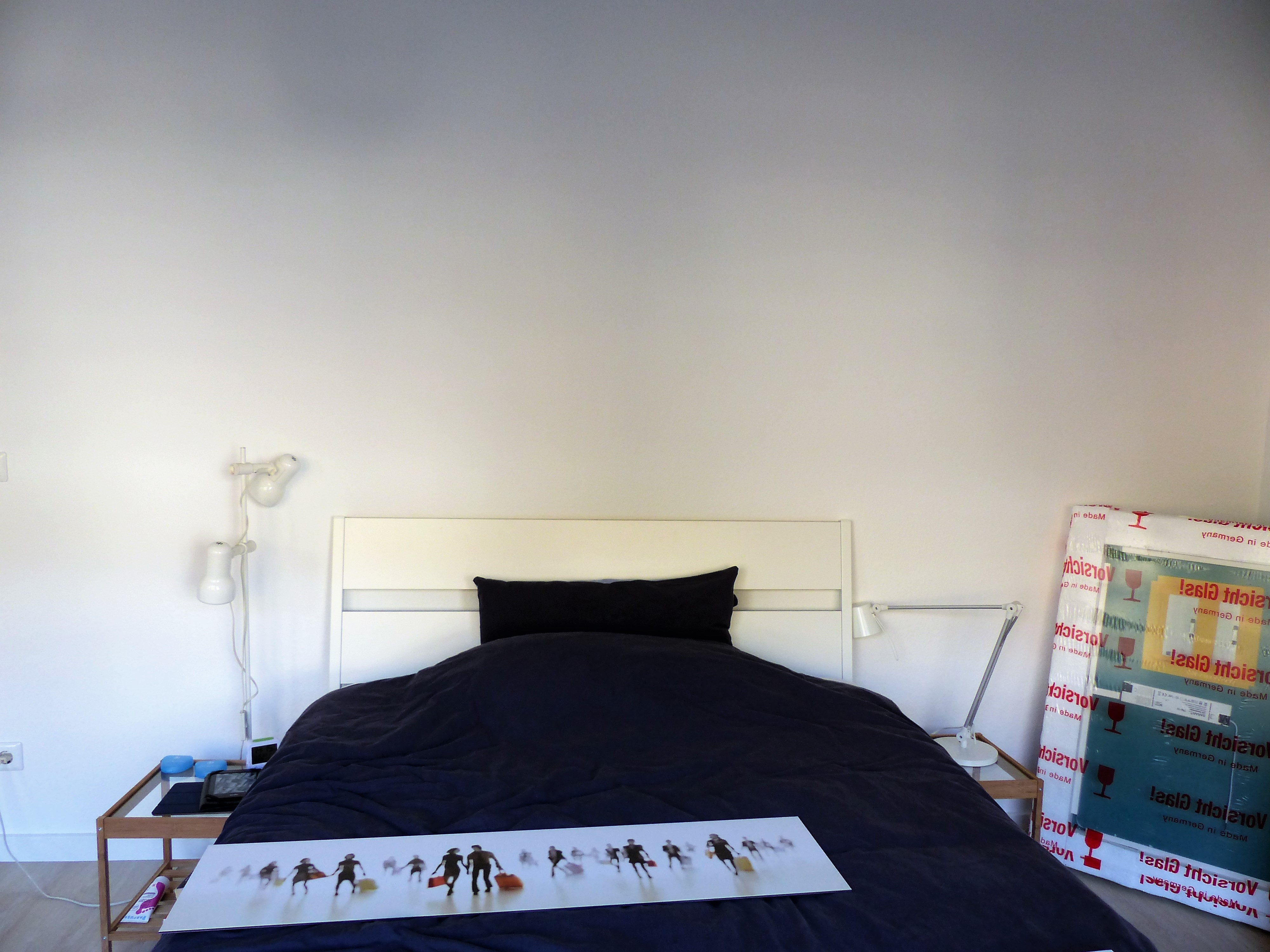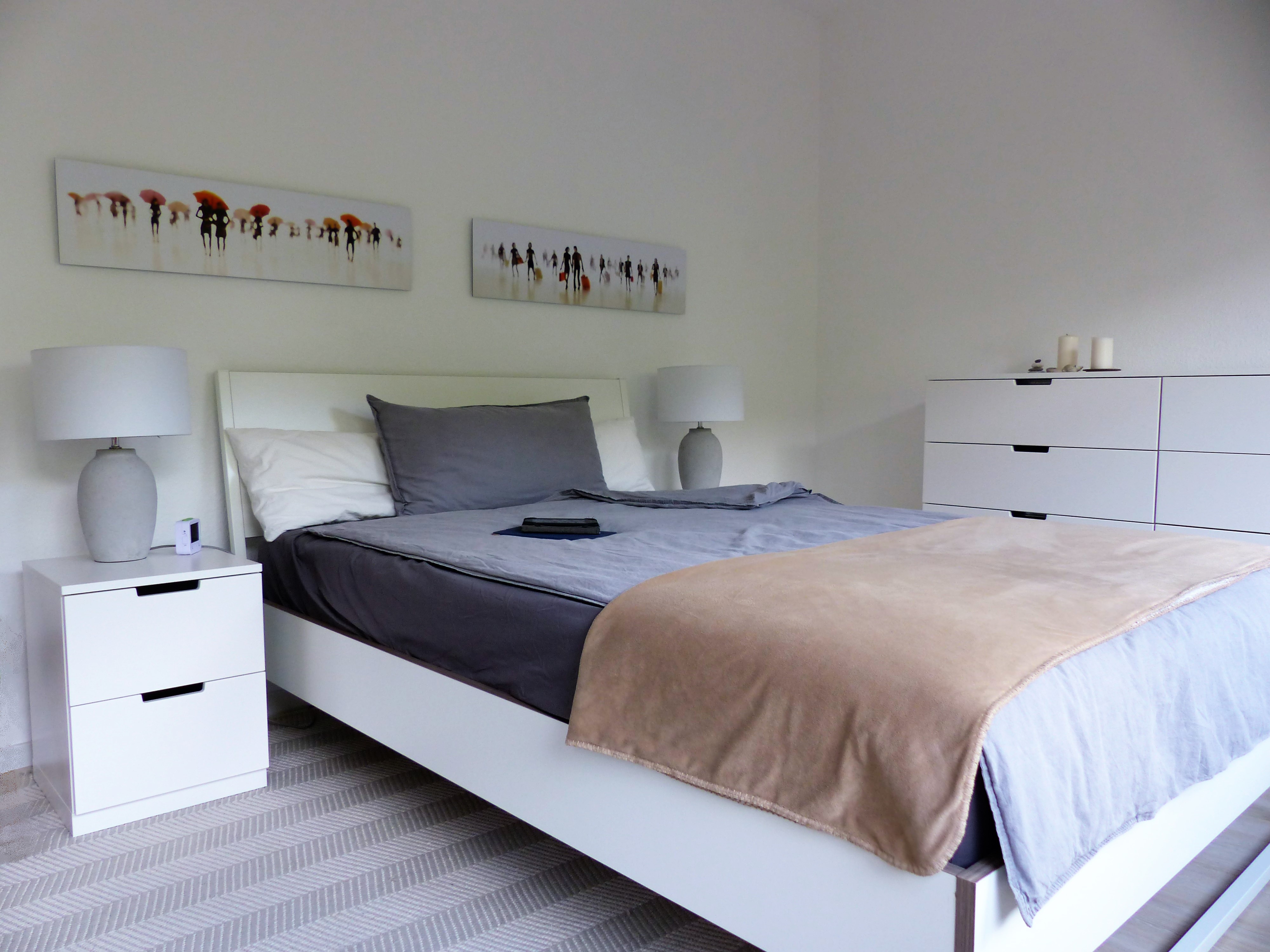 Die Wand hinter den Kommoden bekommt noch einen grauen Anstrich und eine schöne Bildersammlung, wie im Entwurf. Aber auch jetzt ist es ein ruhiges Schlafzimmer, ideal zum Entspannen.