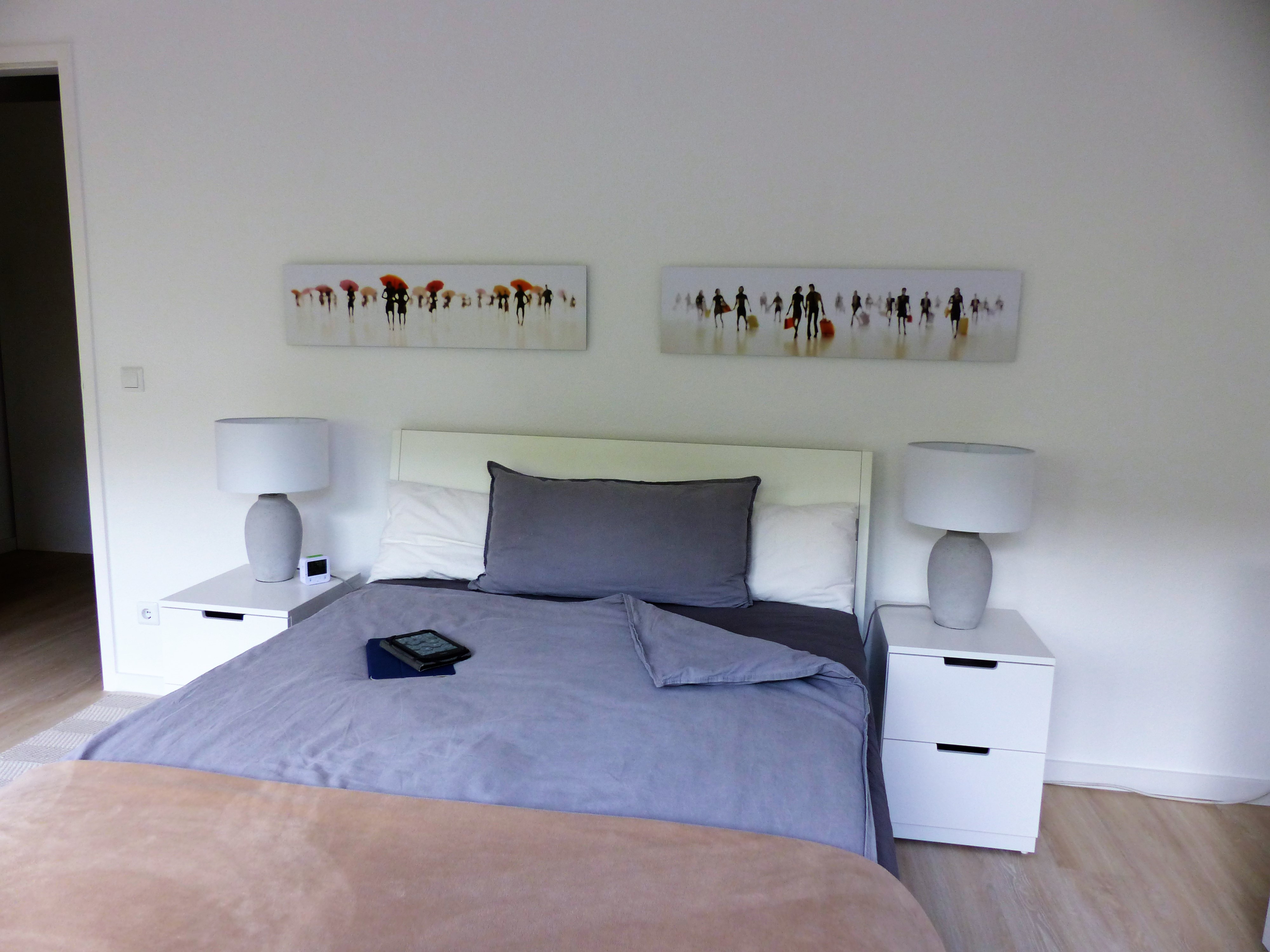 Neue Nachttische und Lampen rahmen das Bett ein und die beiden schmalen Bilder sorgen für eine harmonische Gestaltung. Da sie sehr tief hängen, ergibt sich eine optische Verbindung zum Bett und gehören dadurch zusammen.